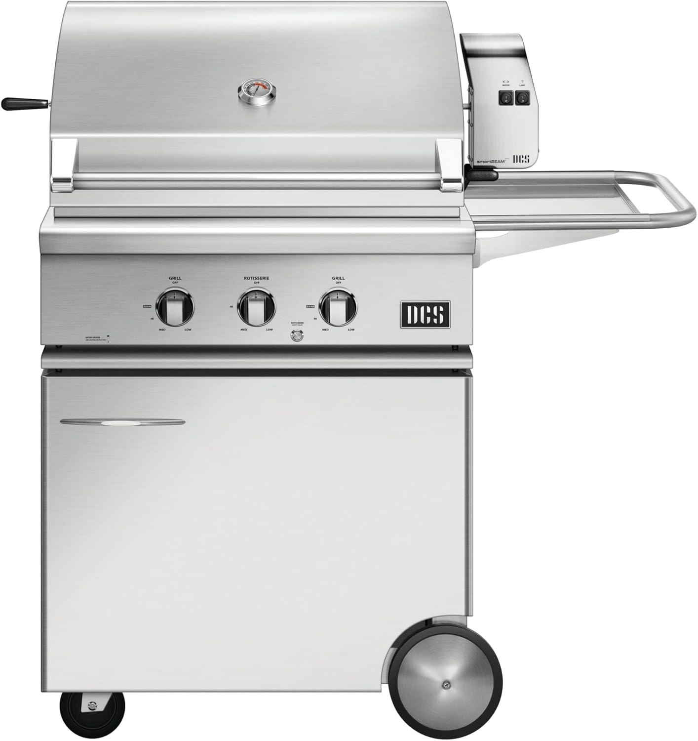 Features: Two 25,000 BTU U-burners One 14,000 BTU infrared rotisserie burner able to turn up to a 50 lb. load The precision ported U-shaped stainless steel burners offer premium and performance, and a heat shield directs heat upwards maximizing heating efficiency 748 sq. in. total cooking area Choose the precise heat you need from a low and slow 300° up to an intense 1100° allowing you the versatility to cook anything from vegetables, to your favorite fish or meat, to the perfect pizza Assembled by hand from heavy duty 304 grade stainless steel, inside and out, DCS grills are built to handle most everything Mother Nature can throw at them Start up the grill quickly and easily with the one-step direct burner ignition Built-in temperature gauge lets you know exactly how hot the grill is, even when the hood is down Features a removable drip pan, conveniently located in a slide-out tray to allow for easy Grill cart sold separately Covered under DCS Appliances' class-leading including 2 years full coverage for parts and labor and a limited on the grill burners, hood, cooking grates, burner box and racks Product Technologies: Ceramic Radiant Technology: A layer of ceramic rods provides intense yet even heat. It gives a consistent grilling surface, with controlled heat rather than direct fire. Smart Beam™ Grill Light: A halogen light is designed to illuminate the entire cooking surface for perfect night grilling. Specifications: BTU Output: 64000 Total Cooking Area: 748 Sq. In. Number of Burners: 3 Control Type: Turn Knob Fuel Type: Liquid Propane Burner Style: Infrared and Stainless Steel Height: 24-1/4" Width: 30" Depth: 26-7/8"