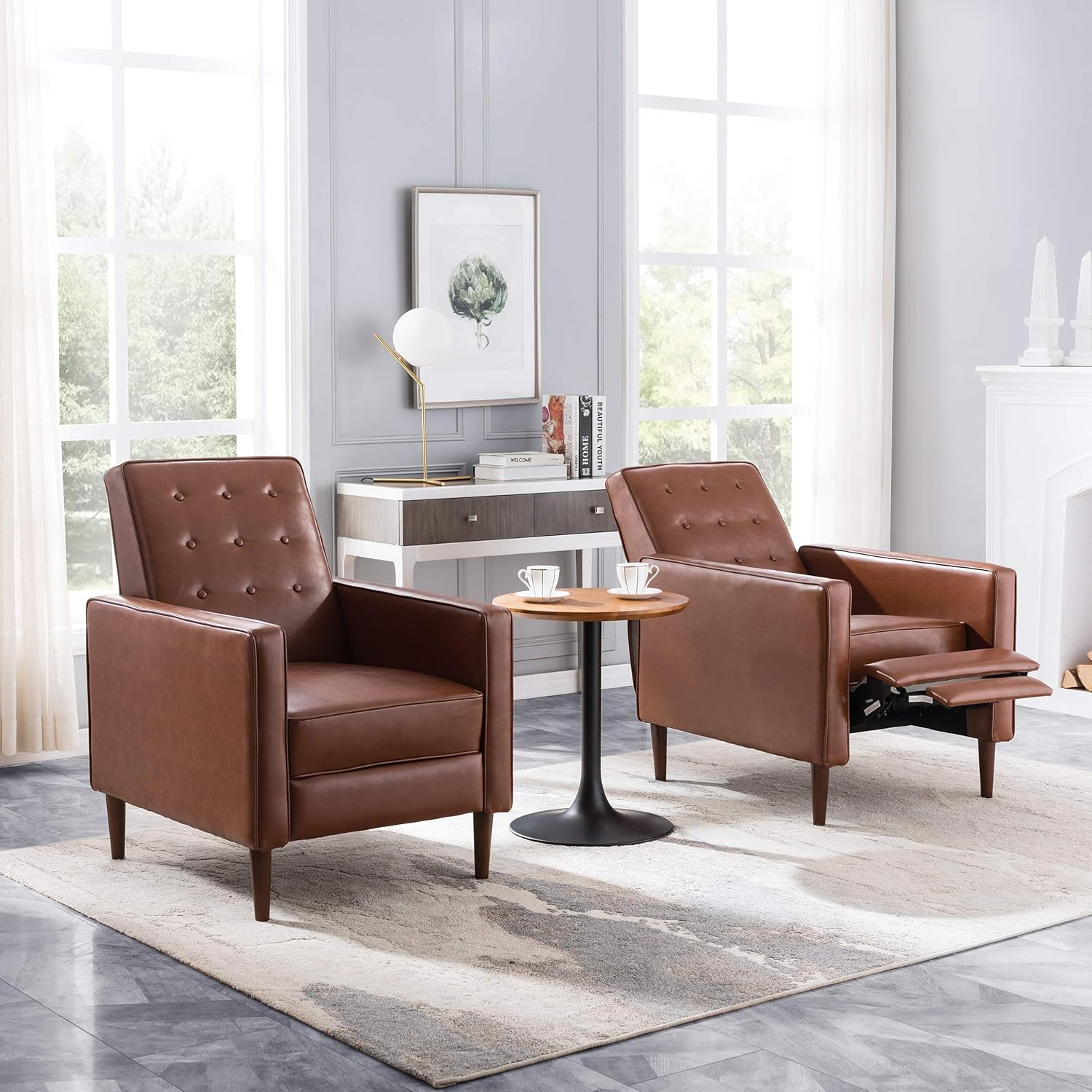Looking for a place to prop up your feet and relax after a long day of work? Our mid-century modern recliners are a wonderful addition to any living room decor. Featuring clean lines and a smooth finish, these recliners offer you incredible comfort as well as sleek style. This is finished with lovely tapered legs for a sturdy structure and outstanding design. Complete with a beautifully button-tufted backrest and smooth upholstery for maximum comfort, these recliners will easily turn into your favorite place to unwind. Includes: Two (2) Recliners Material: Faux Leather Leg Material: Birch Wood Color: Cognac Brown Leg Finish: Dark Espresso Hand-Crafted Details Assembly Required Dimensions: 34.25 inches deep x 27.00 inches wide x 38.00 inches high Extended Dimensions: 59.50 inches deep x 27.00 inches wide x 28.00 inches high Seat Dimensions: 21.50 inches deep x 20.00 inches wide x 18.50 inches high Arm Height: 25.00 inches