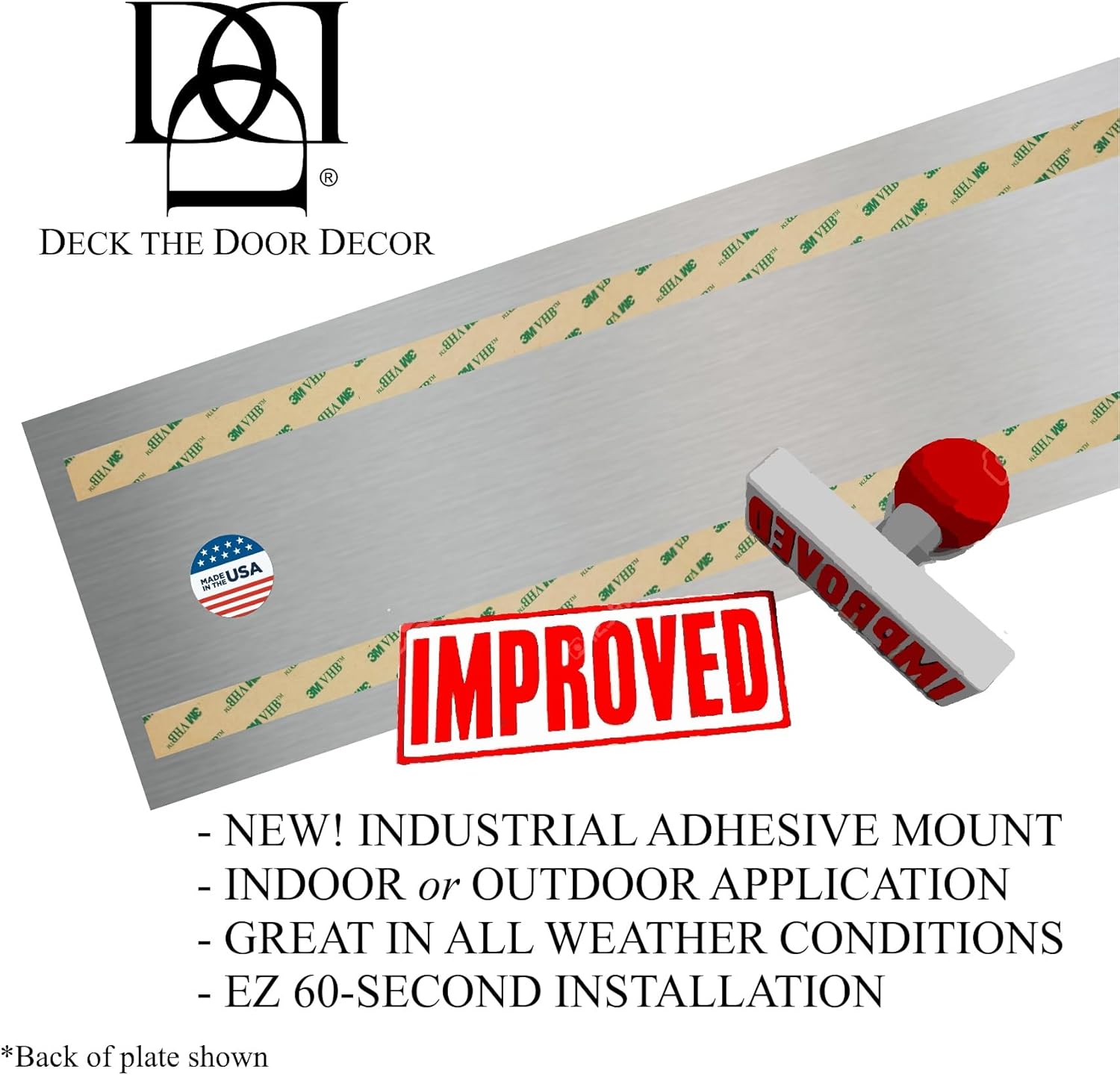 Elevate both the style and protection of your entryway with the Deck the Door Satin Nickel Door Plate Bundle, which includes one 8""x34" Kick Plate and one 3""x12" Push Plate. Proudly made in the USA, these high-quality door enhancements are crafted from durable anodized aluminum and feature a timeless satin nickel finish that complements a wide range of home or office decor styles. Designed for both form and function, the kick plate guards against scuffs, scratches, and shoe marks, while the push plate helps prevent wear and tear from frequent handling. Both items come with industrial-strength 3M self-adhesive backing, making installation quick and tool-free—just peel and press into place in under a minute. Built to last, these plates resist rust, tarnish, and fading. Minimal maintenance is required—simply wipe clean with soap and water to keep them looking new. Ideal for both interior and exterior doors, this matching set provides a polished, professional appearance that's as protective as it is decorative. Deck the Door is a family-owned business dedicated to quality craftsmanship and elegant design. From humble beginnings at home to scalable production, our mission remains the same: to deliver stylish, durable, and easy-to-install door solutions that make a lasting impression at every entryway.