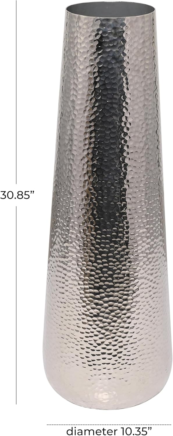 Aluminum is welded together to form this modern vase for home decor with a unique hammered texture. Polished silver vase for dried flowers has an elongated round shape with a hammered surface. Wipe clean with a dry cloth. Accessorize your space effortlessly by displaying a beautiful floral arrangement or greenery with this decorative vase. Create a balanced surface space and added dimension with this beautifully crafted vase. Use this silver centerpiece vase in your living room and place it on a polished wood surface with or without dried flowers as an accent piece. Designed with felt or rubber stoppers at the base that prevent scratching furniture and table tops, as well as sliding around. This item ships in 1 carton. Suitable for indoor use only. This item ships fully assembled in one piece. Made in India. This is a single silver colored vase. Modern style. Vase has a 6.50 in mouth opening.