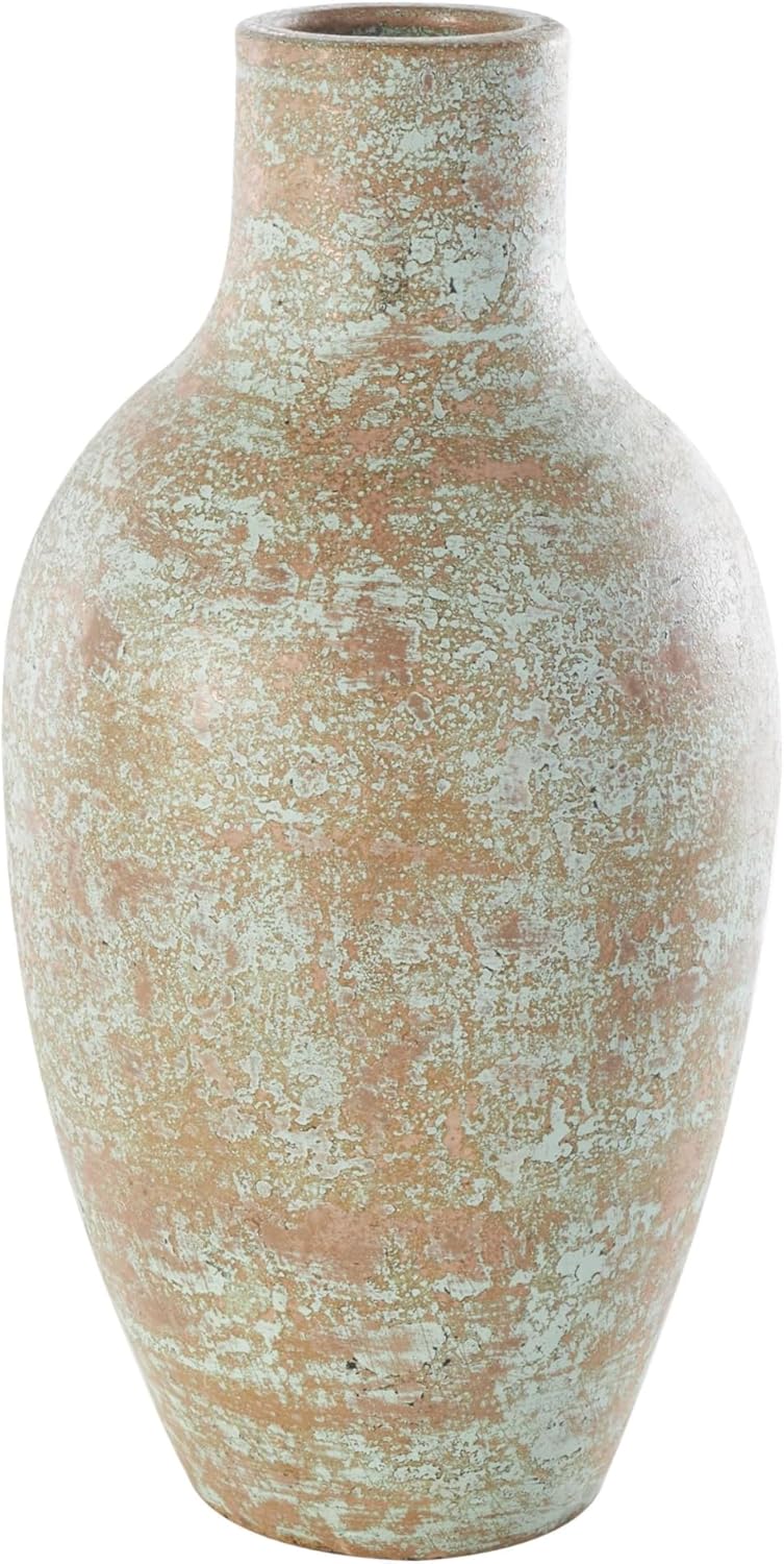 Adorn your mantle or dining table with this antique vase, filled with fresh floral or greenery, to create a timeless centerpiece that enhances your home decor. Designed with felt or rubber stoppers at the base that prevent scratching furniture and table tops, as well as sliding around. This item ships in 1 carton. Ceramic vase makes a great gift for any occasion. Suitable for indoor use only. This item ships fully assembled in one piece. Made in Indonesia. This is a single brown colored vase. Farmhouse style. Vase has a 3 in mouth opening.