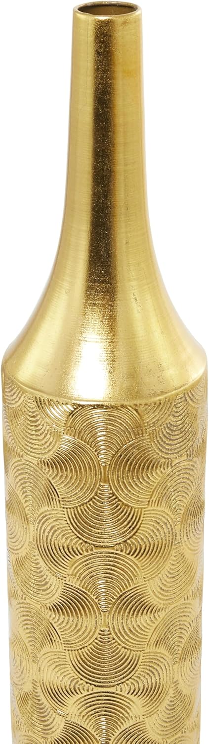 Expertly crafted, the modern set of 3 vases for home decor is constructed using welded iron with refined metalwork techniques, highlighting how the iron is welded with etched swirl patterns. The round shape with the swirl patterns makes these satin gold vases for decoration both stylish and versatile. Wipe clean with a dry cloth. This vase is perfect for displaying flower filler and twigs, or leave them empty and fill up any negative space in a corner. Create depth and form onto your space by displaying these beautifully crafted vases. Ideal for living rooms or dining areas, the gold set of 3 centerpiece vases offers a modern touch. Designed with felt or rubber stoppers at the base that prevent scratching furniture and table tops, as well as sliding around. This item ships in 1 carton. Suitable for indoor use only. This item ships fully assembled in one piece. This gold colored iron vase comes as a set of 3. Modern style. Vases have 1.50 in, 1.30 in, and 1 in mouth openings.