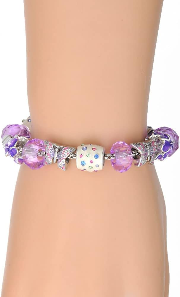 Silvertone Shark Purple Butterfly Bead Charm Bracelet. Charm size is approx. 0.78 x 0.82 x 0.32 inches (HxWxD) including loop. Silver tone chain bracelet is 7 inches long with a 1 inch extender chain. Lobster Claw Clasp. Fits Wrists 6.5-7.5 inches. Charm bracelet has purple and pink enamel butterfly beads, purple tropical flowers, and purple faceted glass beads, and white enamel tropical multi-colored crystal beads. Beads may vary slightly since this item it made to order. Butterflies are symbols of transformation, resilience, and triumph. Purple symbolizes spirituality, royalty, and imagination. Wear this bracelet to inspire, uplift, and encourage you. PLEASE NOTE: Our products are not intended for those 14 years and younger.