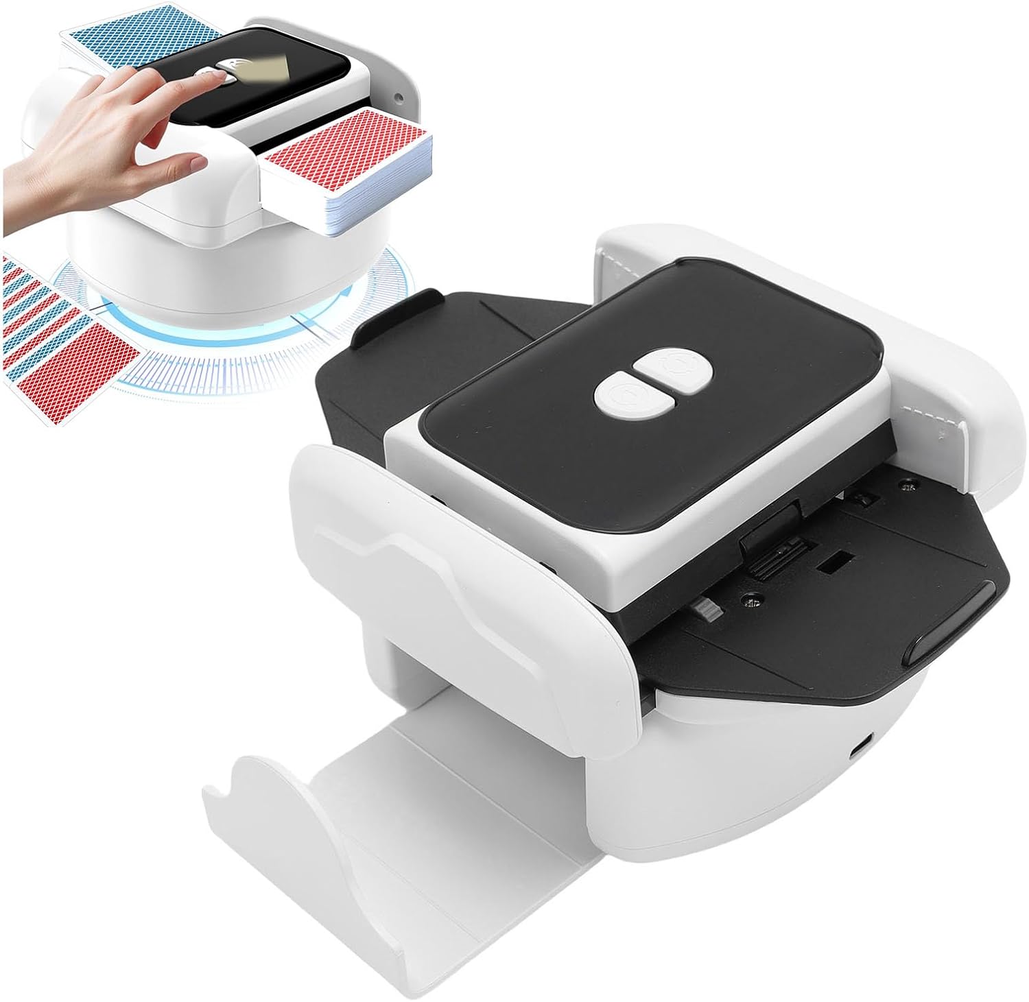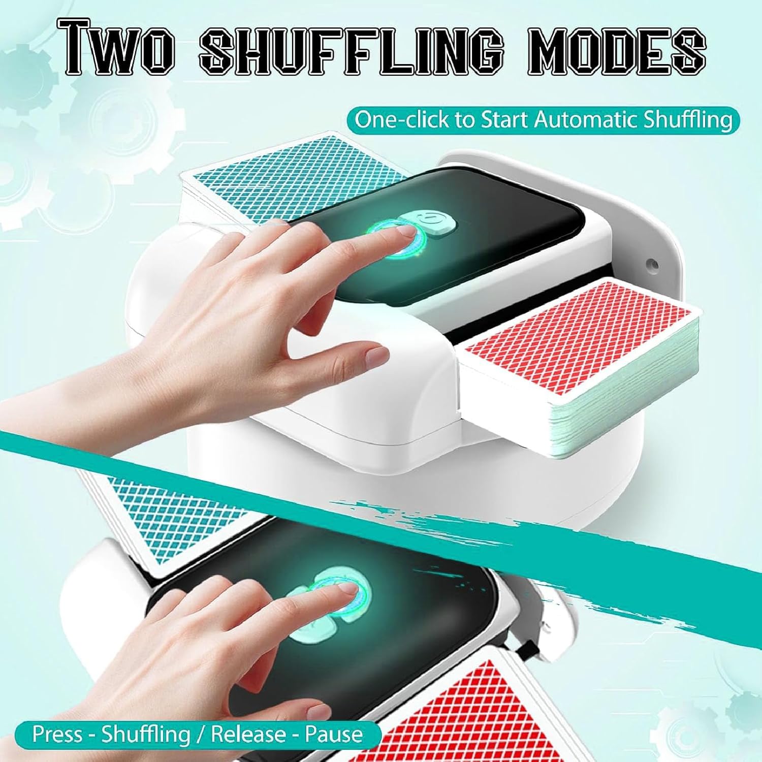 1. ONE BUTTON OPERATION: Simply press the button to start shuffling. Enjoy the convenience of easy shuffling, ensuring a smoothly and seamless deck shuffling every time. 2. 2 SHUFFLING MODES: Choose between 2 shuffling modes to enjoy a convenient and efficient shuffling experience while minimizing wear and tear on your cards. 3. QUALITY MATERIALS: Made from quality ABS, this playing card shuffler features a stylish and rounded appearance without sharpened edges, ensuring safety and durability during use. 4. ACCURACY GEARS: The accurate gear design guarantees optimal shuffling efficiency while reducing noise and vibration, saving you both time and energy in your gaming sessions. 5. BUILT IN RECHARGEABLE BATTERY: Equipped with a 1600mAh lithium ion battery, this automatic card shuffler is suitable for using outdoors or at home, providing portability and convenience wherever you play. Spec: Item Type: Card ShufflerMaterial: ABS Built in Battery: Lithium ion Battery Applicability: Outdoor, Home Playing How to Use: Power on/off, this product uses type c charging cable for charging; when charging, the redindicator light is on; when fully charged, the light goes off. Place the cards on the card tray on both sides of the shuffler, long press the shuffling button to start shuffling and press the same button again to stop shuffling. After shuffling, remove the shuffled cards from the card stack. packing list: 1 x Card Shuffler 1 x USB Cable 1 x Instruction Manual 1 x Base Tray