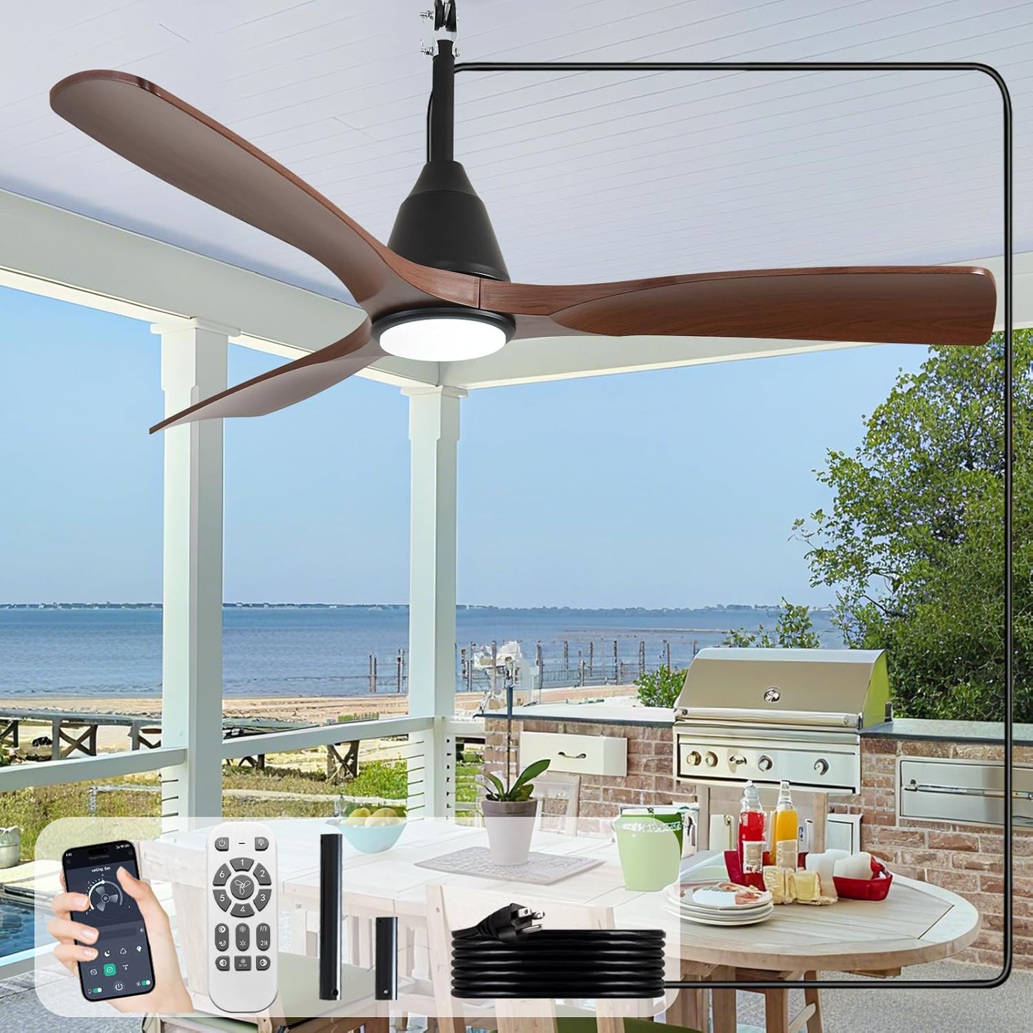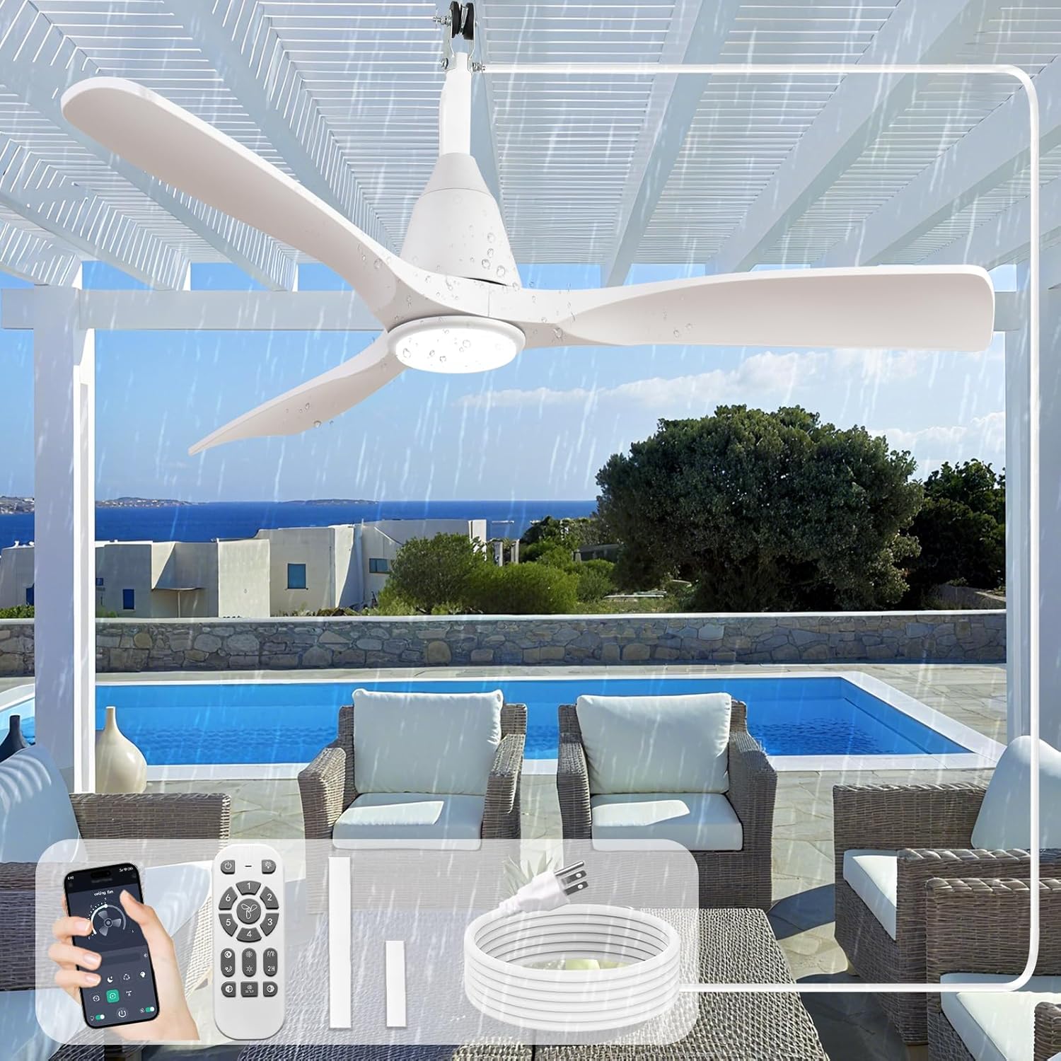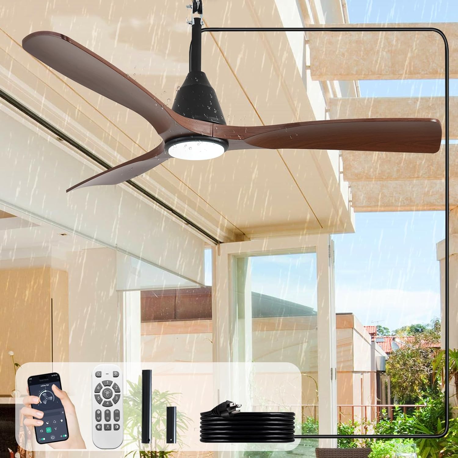 Depuley Outdoor Ceiling Fan with Lights: 52" Silver Gazebo Fans Outdoor Hanging with Remote APP Control - Plug in Waterproof Fans with Light for Patio Porch Reversible Wood Blades 3CCT 6 Speeds Timer