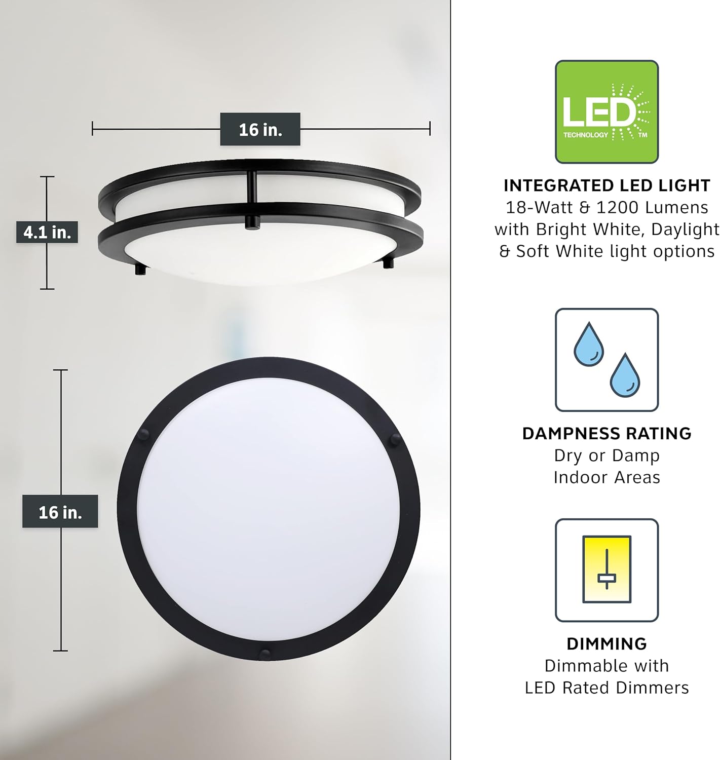 Add bright interior illumination and a touch of elegance to your home with our DESIGNERS FOUNTAIN ceiling mounted light fixture. Construted with durable quality materials and featuring a white frosted acrylic lens, this ceiling mounted light fixture cover is great for adding a touch of class and sophistication to your home decor, and is perfect for use in your bathroom, bedroom, laundry room, hall way, stairwell, entry way, closet, garage, and other indoor spaces. This interior light fixture features a LED powered lighting engine instead of light bulbs to produce high quality illumination while saving on cost and energy. Our simple light fixture measures 16 W x 16 D x 4 H in inches, and features integrated LED with 1800 lumens and 90 CRI, using only 27.5 watts. The close to ceiling light fixture features selectable 3000K, 4000K, and 5000K color temperatures, and is dimmable with Triac Dimmers. This ceiling light is ETL/cETL certified, Energy Star listed, Title 24 compliant, and comes with a 5 year warranty to ensure durability and long-lasting performance. Enhance your home's lighting with this elegant and contemporary light fixture.