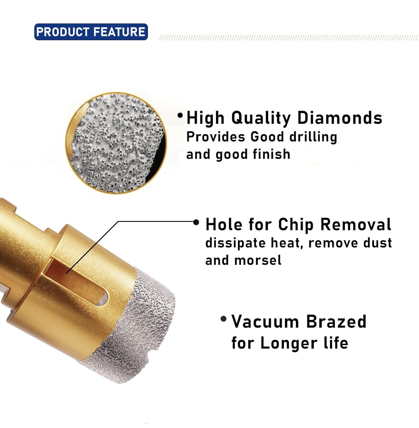 | Compatible Material | Porcelain, Ceramics, Bathroom Tiles, Granite, Marble, Masonry, Concrete, Glass, Hard Plastic |