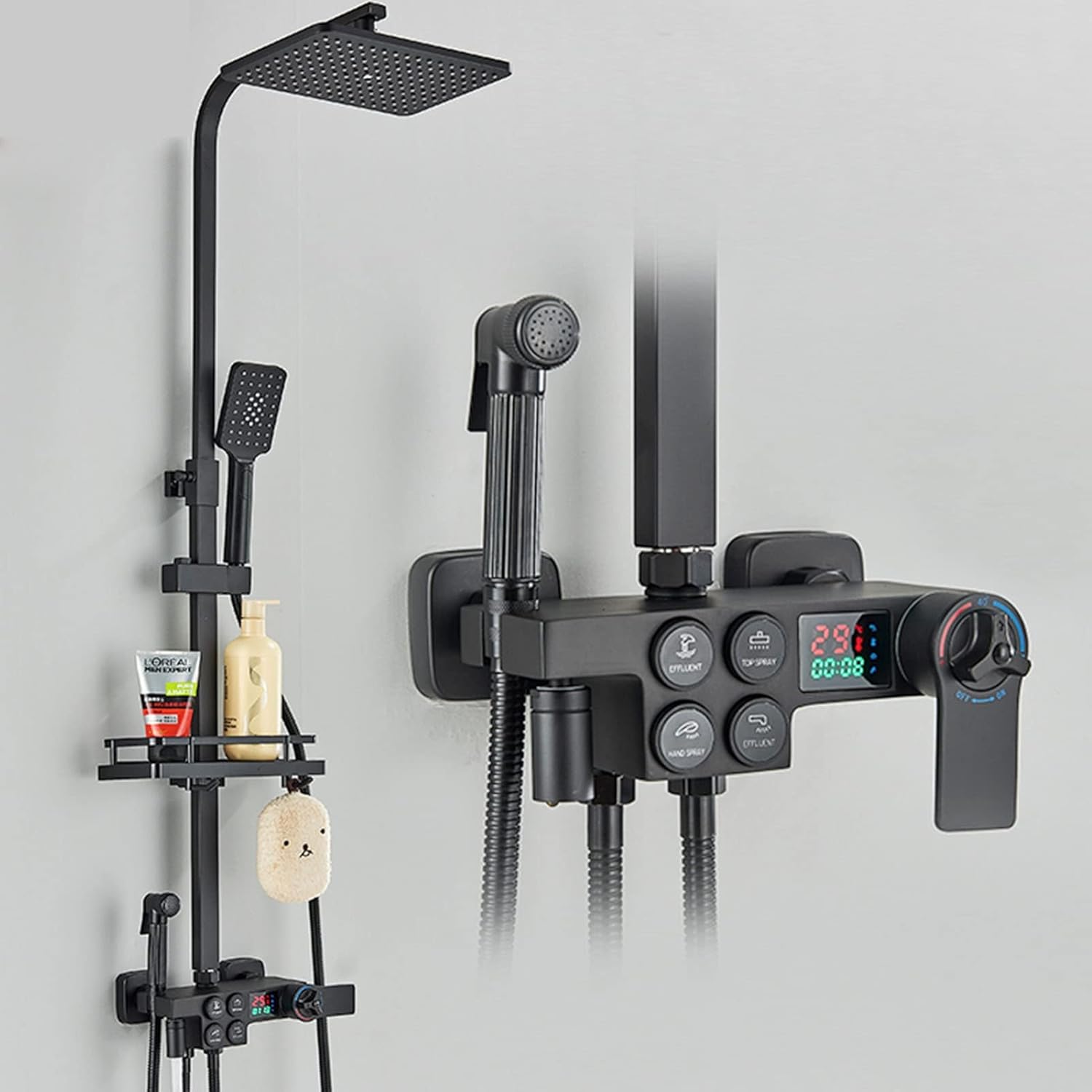 Bath & Shower Faucet Type: Bathtub Shower FaucetsMaterial: Brass Body Shower Head Material: ABSHand Shower Material: ABSValve Core Material: Ceramic Shower Head Shape: Square Finishing: BlackType: Fixed Rotatable Type: Contemporary Number of Holes: 2 Number of Handles: 4 buttonCold and Hot Switch: Yes Feature: Cold and Hot Mixer Tap Type: Thermostatic Shower FaucetCold/Hot Water Control Type: Single Holder Dual ControlFeature: Rainfall Shower Head, Hand Shower, Tub Spout, Bidet Hand ShowerInstallation Type: Wall MountedExposed Shower Faucet Feature: With Slide BarInstallation Distance 135-160mm(5.31"-6.29") After Sale: If you have any questions about the shower faucet set, please do not hesitate to contact us. Usually we will respond to your email within 24 hours