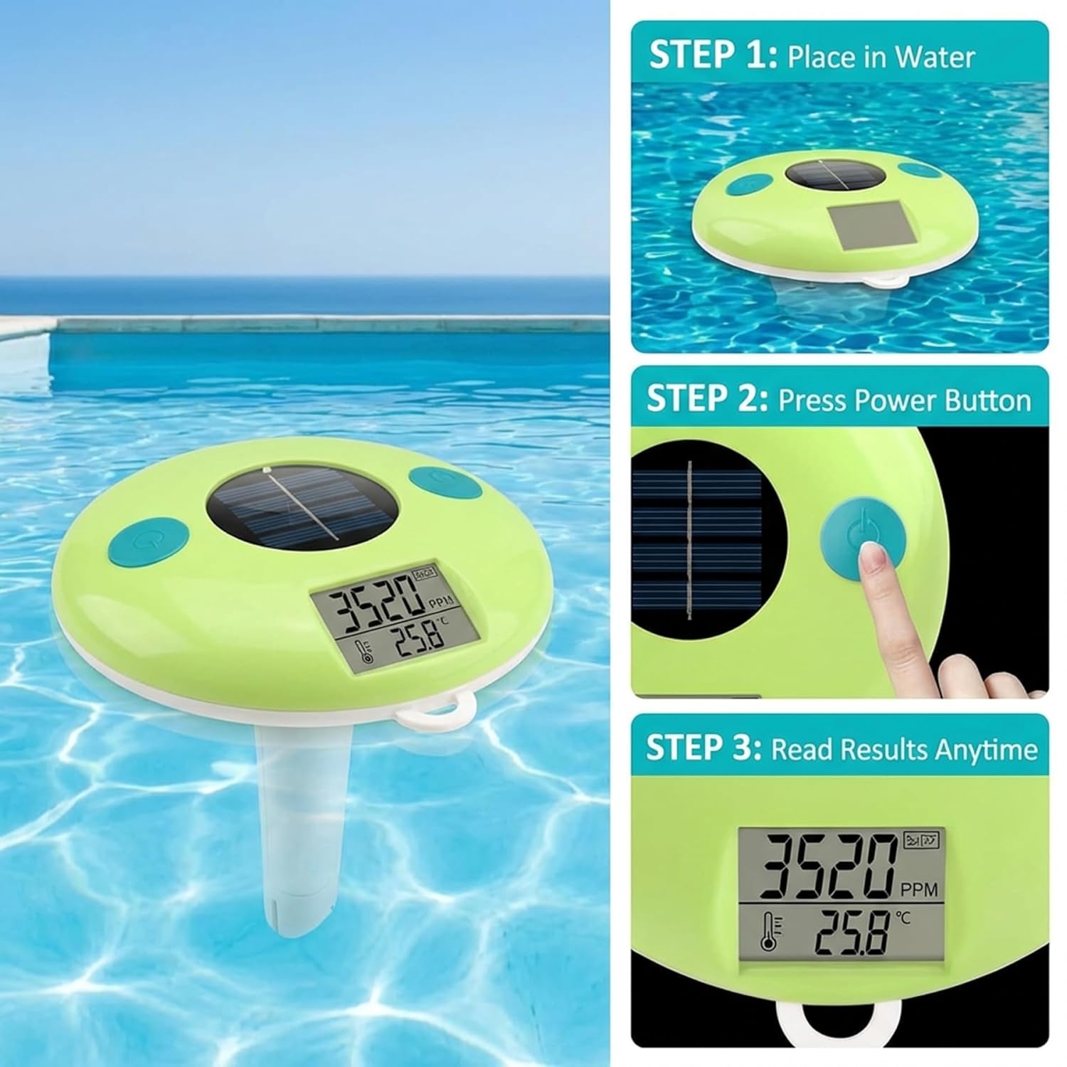 Description: Keep your pool, hot tub, or spa perfectly balanced with the Solar Water Monitor. This innovative device combines two essential water testing functions into one easy-to-use, floating tool.Engineered for clarity and convenience, the monitor features a large, anti-glare LCD screen tilted at a 35-degree angle. This design ensures you can check your water's salt concentration and temperature at a glance from the pool deck, without straining your eyes. Simply place the unit in the water, and it will float while continuously working.Harness the power of the sun for sustainable operation. The built-in solar panel efficiently charges the device on sunny days, providing reliable power even during overcast periods. Say goodbye to frequent battery changes and enjoy a more eco-conscious way to maintain your aquatic .Crafted from robust ABS plastic, this monitor is built to endure the challenging conditions of pool and spa environments. It is resistant to chlorine, UV rays, and temperature fluctuations. The IPX7 waterproof rating performance even when fully submerged, peace of mind.Ideal for pool owners who both saltwater system management and comfortable water temperature, this 2-in-1 monitor a practical solution. Its automatic data refresh every two minutes keeps you informed, helping you maintain an inviting and well-balanced swimming environment all season long. Features:. -Color: Green + White. -Material: ABS Plastic. -Size: 12.7x20 cm/5x7.9 inch. Note:Manual measurement, please allow slight errors on size.The colors may exist slight difference due to different screens. Package Including 1 * Digital Pool Thermometer