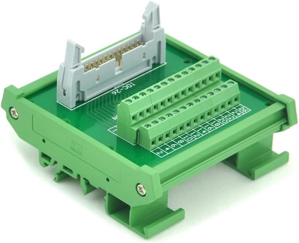 IDC Male header connector, pin pitch 0.1" / 2.54mm. Terminal block: Wire range - 26-16AWG. Strip length - 5mm. Screws - M2,steel,Cr3+ Zn plated. Torque - 0.2Nm (1.7Lb-In.). Pin header and Cage - Brass. Rated voltage: 60V. Rated current: 1A / per pin. Operating temperature: -20 to 50 Celsius. FR-4 fiber glass PCB, dual copper layers. High quality fireproof nylon material DIN rail mount carrier (not China low quality carrier), can support width 35mm / 32mm / 15mm rail, and the carrier can be taken apart for PCB screw mount use.Datasheet: https://images-na.ssl-images-amazon.com/images/I/A1UVn9hNcBL.pdf