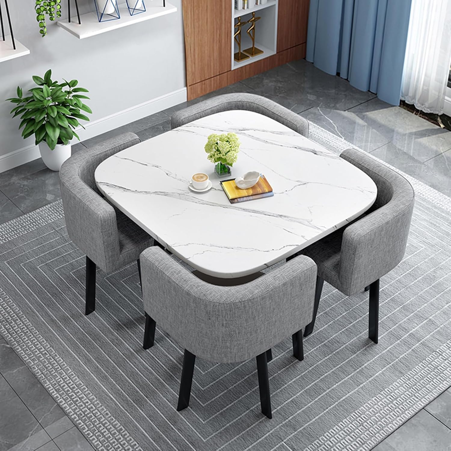 Product Name: Square coffee tableStyle: Modern design table and chair setTable and Chair Material: iron + high-density boardProduct Specifications:Desktop width: 31.4 in/80cmTable Height: 29.5in/75 cmChair Height:28.7in/73cmChair load-bearing: 150kgTwo Fabrics Available: high-quality wear-resistant PU leather/skin-friendly breathable cotton and linenDoes it need to be installed: YesPacking List: 1 table and 4 chairsCafe Table Features:1. Desktop rounded corner design2. Stable and thick bracket3. Comfortable backrest curvature4. Two kinds of fabrics are available5. Save spaceInformation:1. The product is taken from the actual product, there may be some color difference, please understand.2. Products are measured manually, so there may be an error of 1-3cm. Please refer to the actual product received.