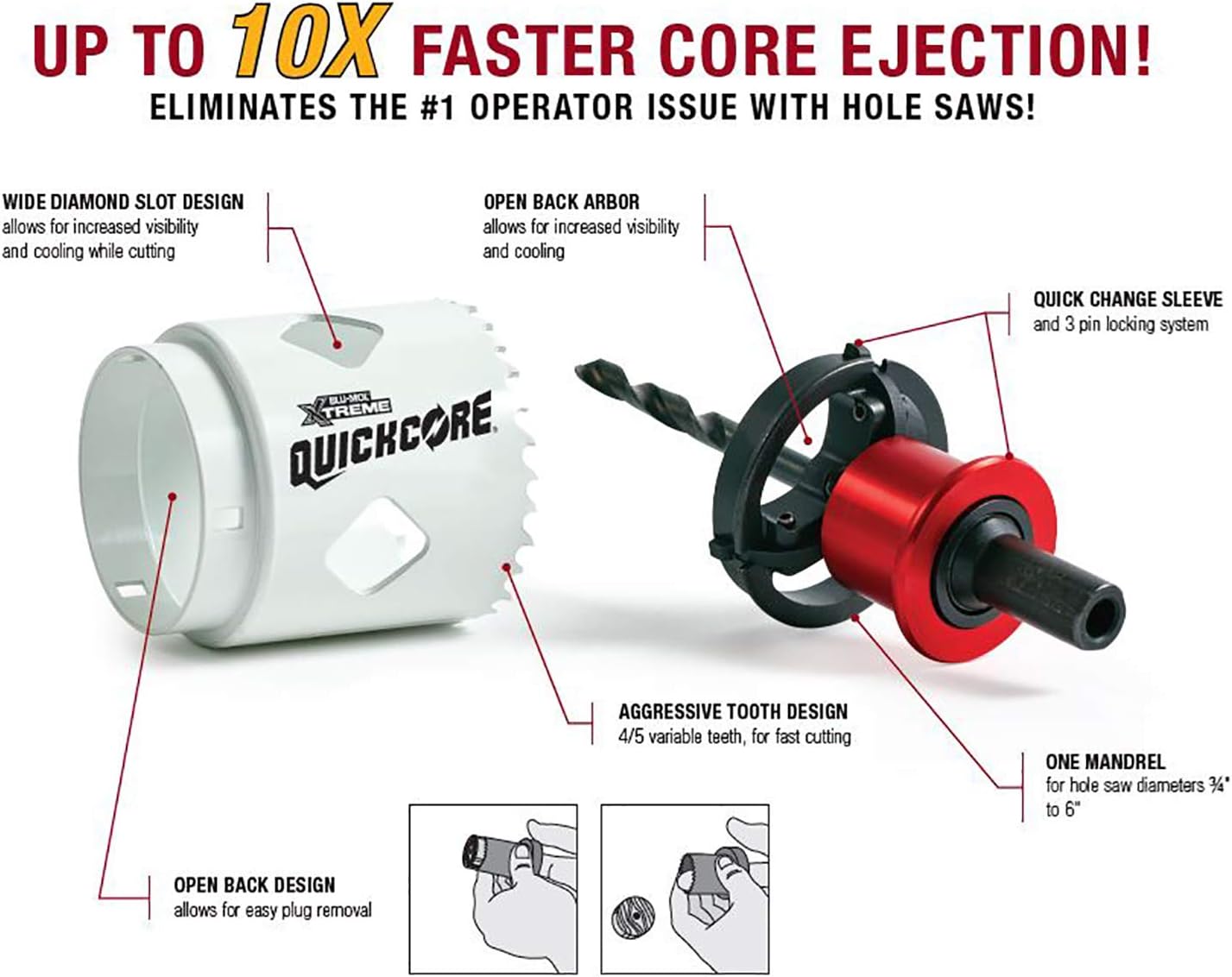 DISSTON Blu-Mol Xtreme QuickCore Hole Saws. Patented hole saw system that has up to 10X faster core ejection. Eliminates the #1 Issue with using a hole saw of core ejection. Quick change sleeve with and open back arbor allows for fast core removal. One Mandrel for all sizes. The wide Diamond slot and open back design allow for increase visiablity and cooling while cutting. The QuickCore design allows for immediate plug removal with no need for added tools. 1 7/8" depth of cut and Bi-Metal construction allows for cutting into wood, metal, plastic, and stainless steel. All sizes of hole saws available.
