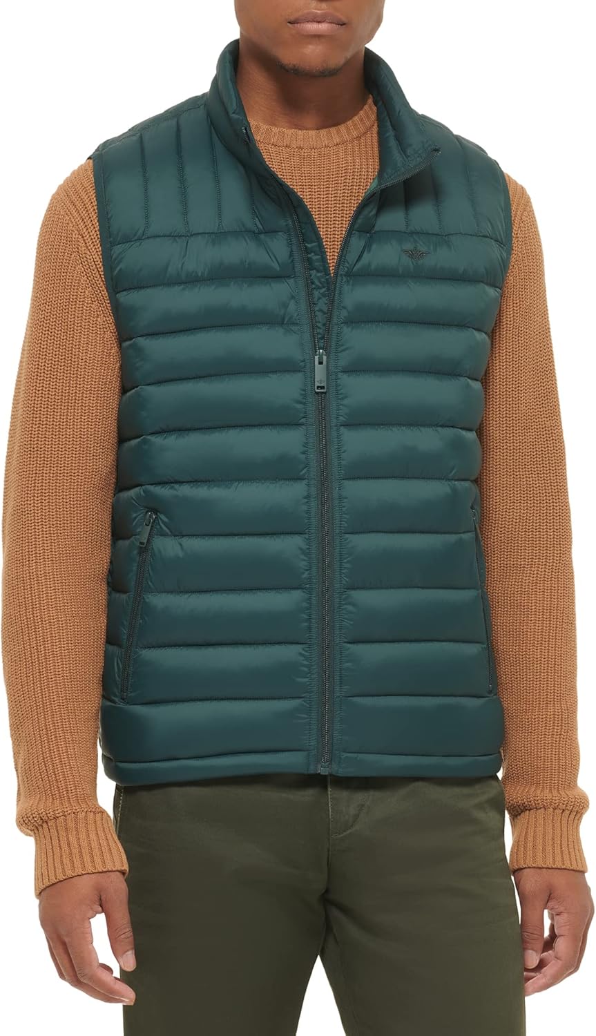Classic ultra loft down alternative fill water resistant packable puffer jacket Lightweight packable jacket in a quilted nylon, stand collar, center front zipper closure, elastic binding at armholes and hem, Dockers anchor logo embroidery on left chest, two lower welt zipper pockets and how to pack screen-print instructions on interior pocket bag.