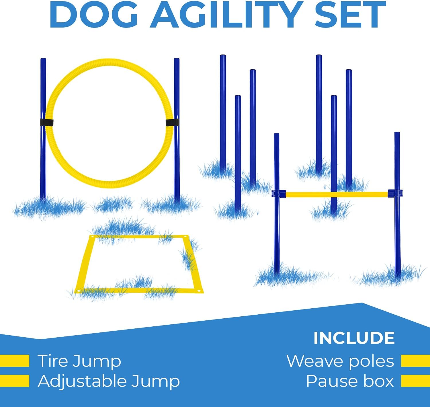 • Dog Agility Equipment- Included in this fantastic set is a; Dog Hoop, Dog Jump, Weave Poles and Pause Box. Have fun while giving your dog a great mental and physical workout.