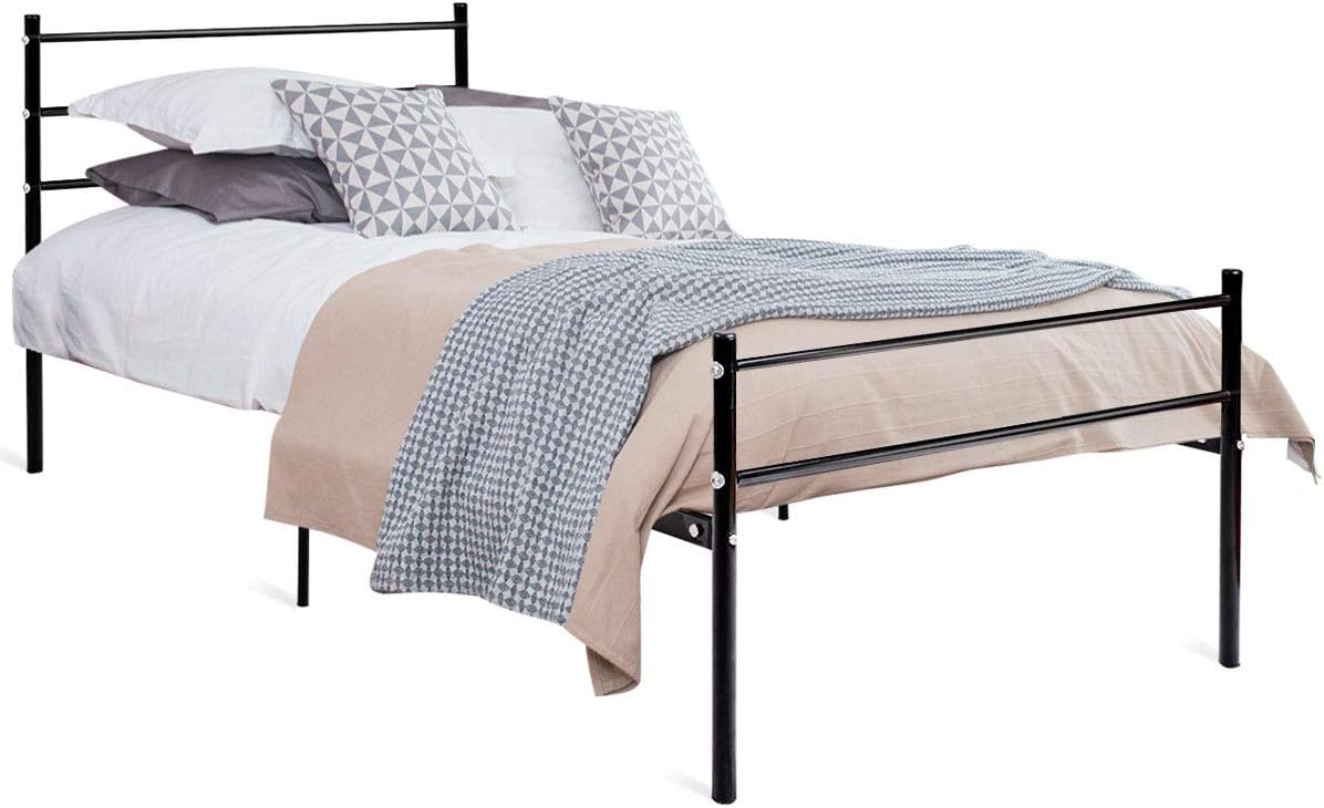 This is our brand new metal bed frame which can provide you with a comfortable sleep experience!Made of sturdy steel and connected with superior screws, our bed frame is durable and has a long service life. Rugged metal slats and heavy-duty legs ensure excellent load-bearing performance. The metal mattress foundation eliminates the need for a box spring and is suitable for latex, memory foam, hybrid mattresses, etc. 12’’ under-bed space provides convenient storage for your luggage, boxes, toys, etc. In addition, with a simple and modern appearance, this bed frame is suitable for a variety of home decoration styles. Don’t hesitate to take it home and add a unique charm to your bedroom! FeaturesMade of high quality steel to form a sturdy frameWith a high load bearing capacity of 220 poundsStable structure to prevent bending and deformationMetal support slats included, no box spring neededConcise headboard and foot board add charm to the bedSpacious under bed storage space to keep your room tidy and organizedComes with straightforward instruction manual for easy assembly SpecificationsColor: Black / SilverMaterial: SteelOverall Dimension: 77.5’’ x 41’’ x 35.5’’ (L x W x H)Net Weight: 26 lbsWeight Capacity: 220 lbsPackage includes:1 x Bed Frame1 x Instruction