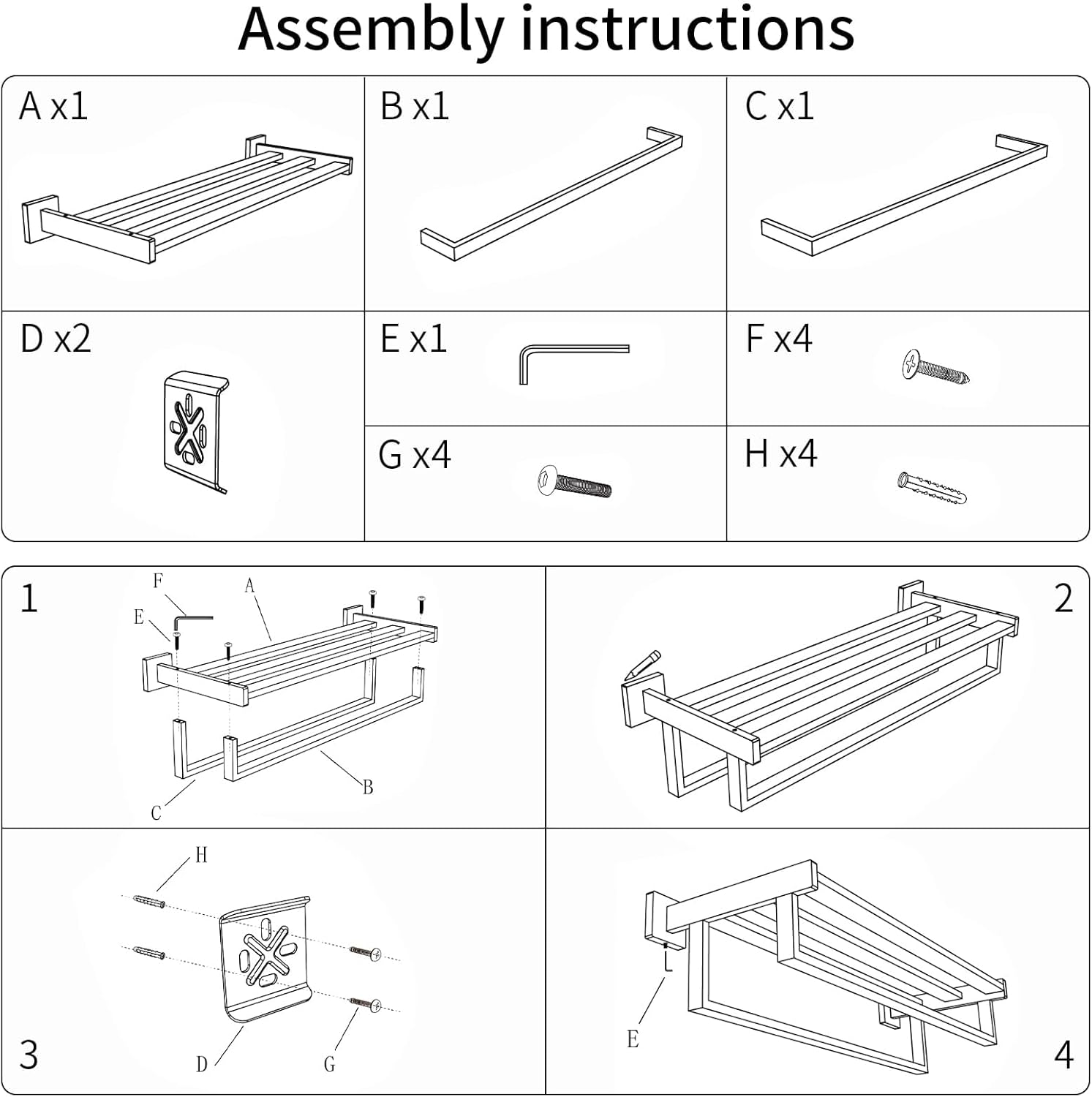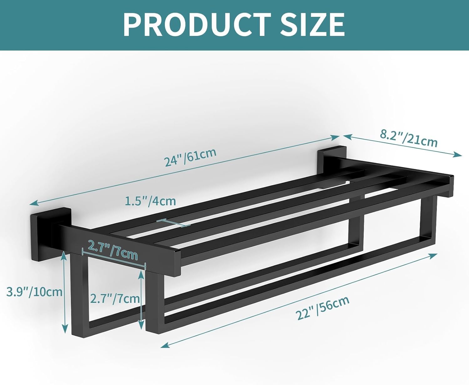 • Size Info:Total length of towel shelf with double towel bar: 24 inches, usable length: 22 inches, width: 8.2 inches, distance between two towel bars: 2.7 inches. Having reasonable spacing enhances breathability, allowing towels to dry faster