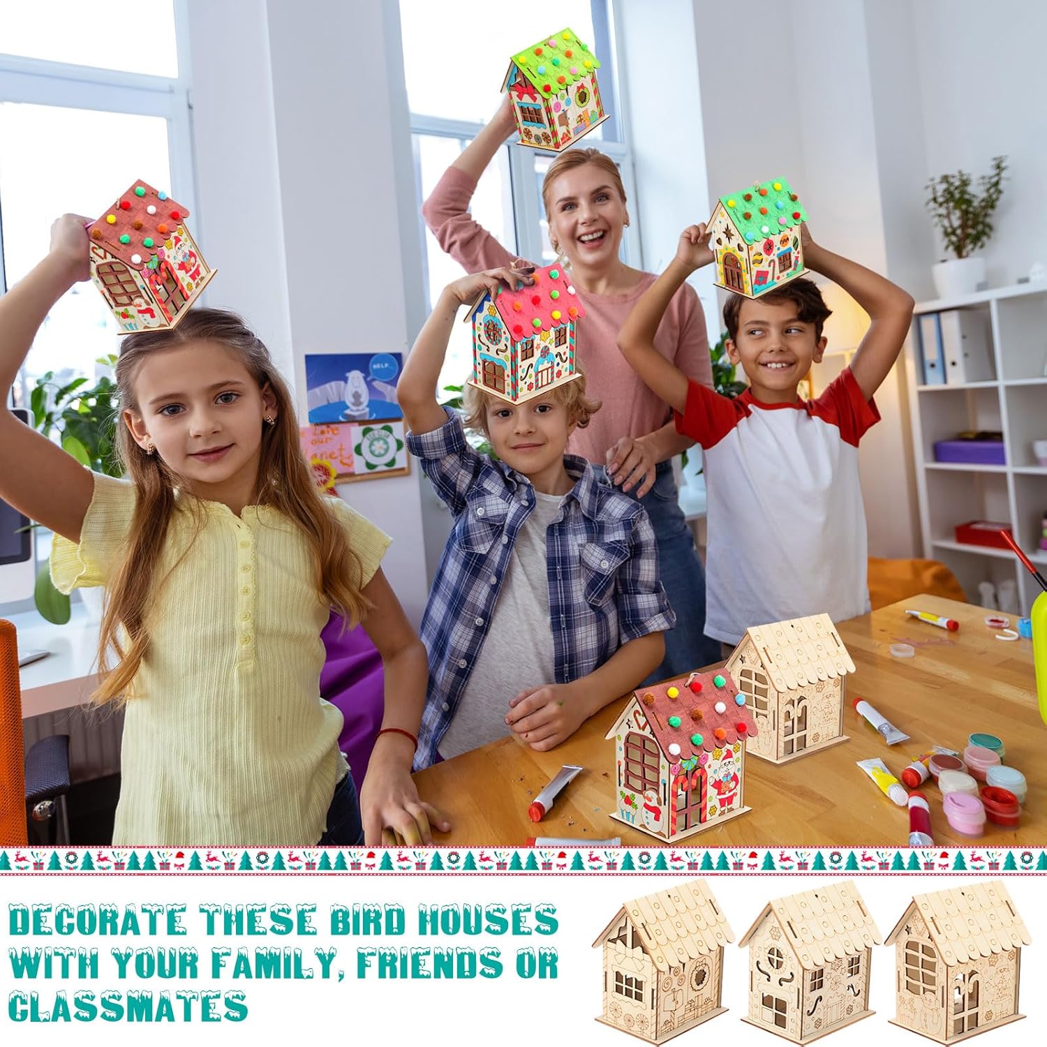 | Included Components | 48 wooden gingerbread house kits, each including wooden pieces to assemble the house, paint, decorative elements (Santa Claus, gingerbread man, snowman, Christmas tree, Christmas elk, etc.), and assembly instructions |