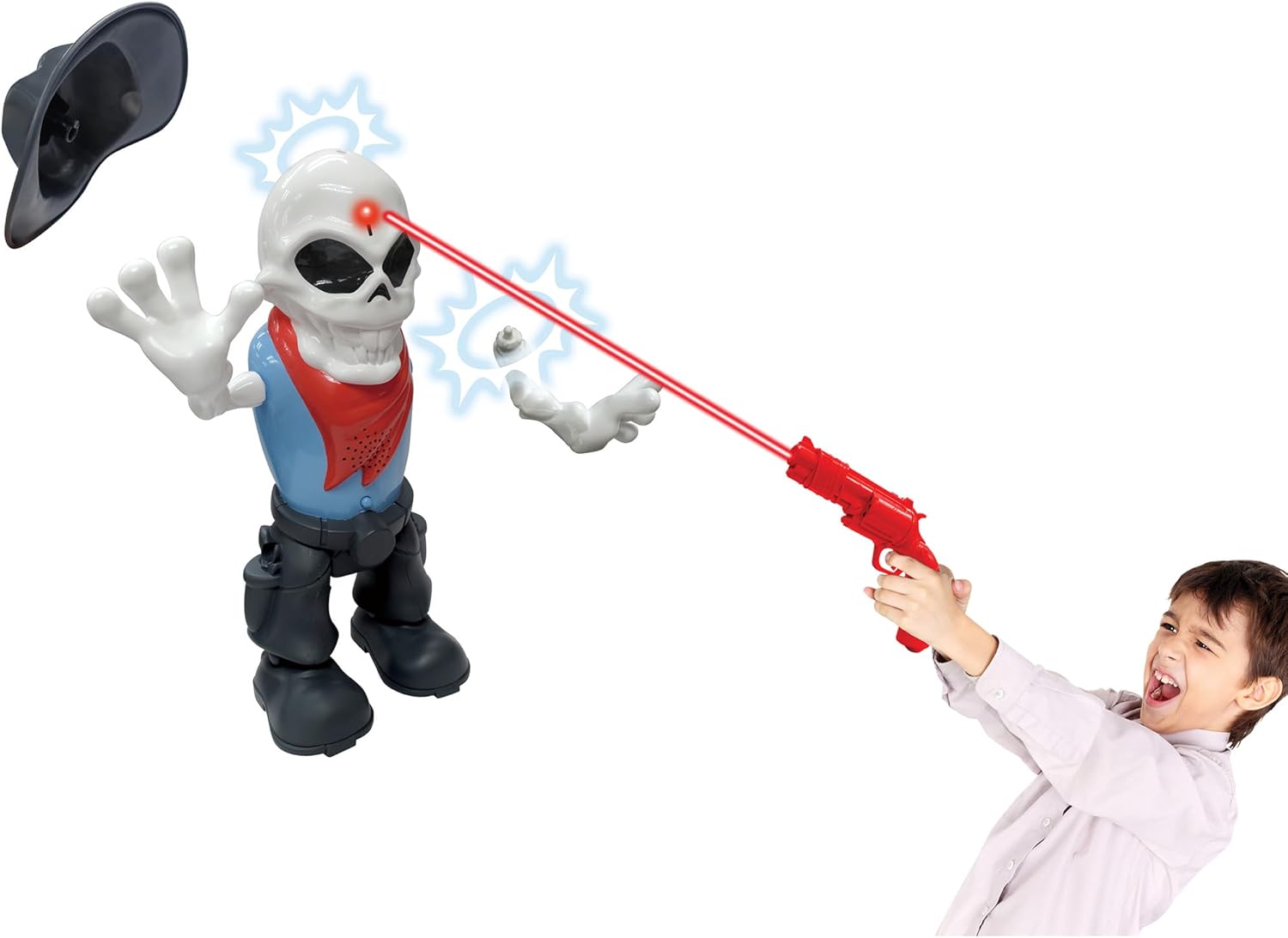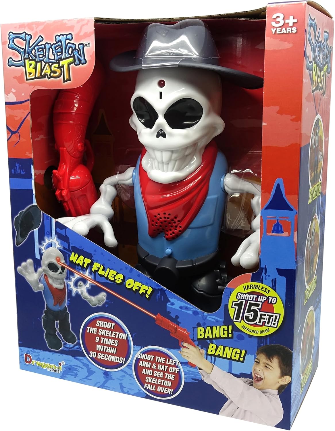 SHOOTING SET: SKELETON BLAST - INFRA-RED BEAM: Practice Makes Perfect! Harmless Infra-red Beam. Shoot the skeleton 9 times within 30 seconds! Bring spooky Wild West excitement to playtime with the Dragon-i Skeleton Blast Infra-Red Shooting Game, an action-filled challenge designed to test aim, speed, and coordination for kids. This interactive shooting set features a walking cowboy skeleton that moves realistically, pushing players to stay focused as they try to land accurate hits within a timed challenge. DETACHABLE PARTS: Using a safe, harmless infrared beam blaster, kids must shoot the skeleton nine times in thirty seconds to trigger hilarious reactions. With each successful hit, detachable parts respond dramatically as the skeleton’s hat and arm fall off before it finally collapses, delivering a satisfying sense of achievement. SOUND EFFECTS: Bring your playtime to life! Authentic gunshot and skeleton zombie sound effects heighten the excitement, making every round feel immersive and lively. CHALLENGE YOURSELF: The adjustable difficulty encourages kids to step farther back, increasing the challenge with a shooting range of up to 15 feet. Easy to reset with re-attachable parts, Skeleton Blast offers repeatable fun that builds hand-eye coordination, patience, and confidence through safe, imaginative target shooting play.