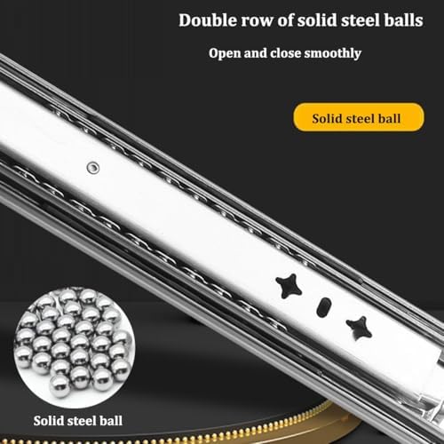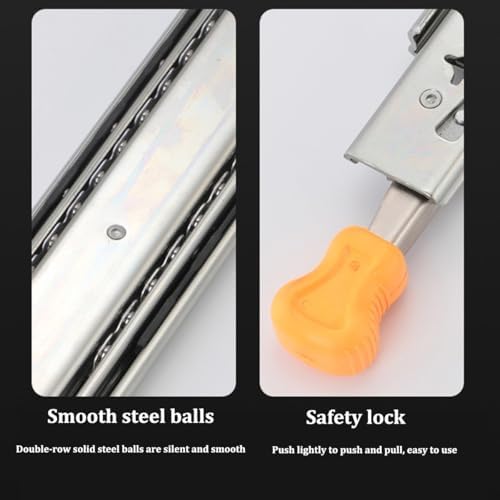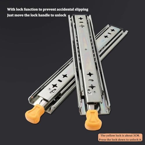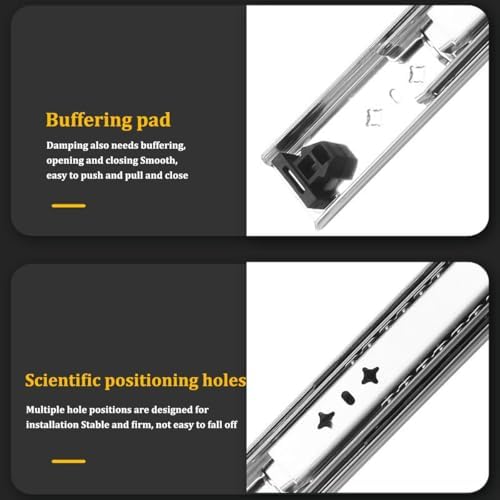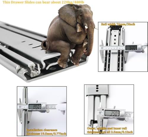 Galvanized Finish: The surface of this heavy-duty drawer slide is galvanized. Buffer Cushion: This heavy-duty drawer slide has a buffer cushion, which can prevent the collision between the three slides and play a buffer and silent effect. Application This heavy-duty drawer slide is suitable for modifying RV equipment, heavy-duty tool cabinets, shelves, cabinets, industrial drawers, trucks, vending machines, etc. Installation Steps ① Find two horizontal lines in the installation position on both sides of the cabinet, and fix the outer fixed slides to the horizontal lines on both sides with screws; (Note: the positioning of both sides must be parallel). ② Completely pull the slide rail, and fix the drawer to the inner fixed rail with screws according to the horizontal line. Specification Style: Simple, Modern Material: Cold Rolled Steel Q235 Color: Silver Quantity: A pair Process: Galvanized Finish Load-Bearing Capacity: 220kg/480lbs Slide Width: 7.6cm/3in Package Included 1 Pair of Heavy-Duty Drawer Slides Notes 1. Please note that the locking mechanism only works when the drawer is fully closed or fully open. 2. Please note that in order to ensure the safety of users, the heavy-duty slide rails cannot be disassembled. 3. Please note that the installation gap on both sides should be more than 19.5mm/0.77in.