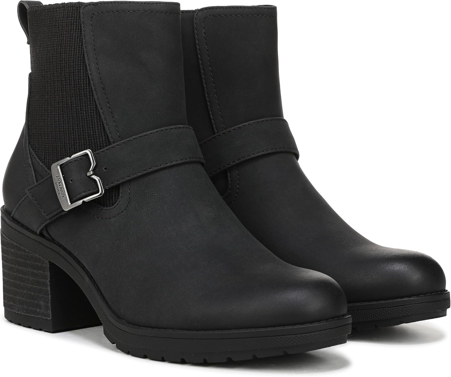 Lug sole Chelsea boots for women with elevated comfort. SUSTAINABLY CRAFTED: Fabric lining and topcloth partially made from recycled plastic bottles. MATERIALS: Low chemical faux leather fabric upper. FIT: Outside stretch gore and inside zip closure for easy on/off. SUSTAINABLE COMFORT: Anti-odor Insole Technology with cushioning, comfort, & support. Insoles partially crafted with 15% cushy, algae-infused BLOOM® foam. MOVEMENT: Lightweight, flexible construction moves with you. STYLE: Womens ankle boots with round toe, Chelsea-inspired stretch gore, strap with iconic buckle detail, back pull tab, and 2 3/4 inch stacked heel with TPR lug sole. CONSCIOUSLY PACKAGED: This style is shipped in an environmentally preferred 1-piece box made with primarily recycled materials that can be recycled & soy-based inks. Fierce and forever original. These block heel moto boots feel just as cool as they look.