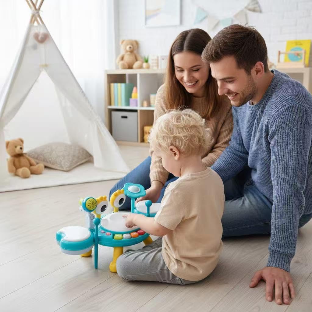 Turn Playtime into a Rockin‘ Concert!Introducing the ultimate Blue Crab Toddler Drum Set – the perfect first musical instrument to spark your child’s creativity and love for music! Designed by early childhood development experts, this all-in-one kit is specially crafted for little hands and growing minds, providing a safe and engaging introduction to the world of rhythm and sound.Why your little one will love it:From the moment they tap the colorful drum pads or grab the wiggly-eye drumsticks, they’ll be captivated. The magic light-up microphone invites them to sing along to 7 cheerful melodies, building confidence and self-expression. With 4 different play modes, the adventure never ends – one minute they’re mimicking a roaring lion, the next they’re composing a piano masterpiece!Why you’ll love it as a parent:We know that safety and development go hand in hand. That’s why our drum set features soft, protective LED lights and adjustable volume settings, ensuring a sensory-rich experience without the worry. The sturdy, easy-to-clean material and rounded edges mean it can withstand even the most enthusiastic jam sessions. Plus, the innovative adjustable legs mean this toy grows with your child, offering lasting value from the baby months well into the toddler years.Product Features at a Glance:Complete Band Kit: 3x Drum Pads, 1x Cymbal, 2x Rattle Drumsticks, 1x Detachable Light-Up Mic.4 Fun Modes: Drum Kit, Instrument Sounds, Fun Sound FX, and 7 Melodies.Grow-Along Design: Converts from floor toy to tabletop station with 4 detachable legs.Safe & Sound: Adjustable volume (2 levels) and soft, non-glaring lights.Developmental Fun: Enhances motor skills, rhythm, and auditory recognition.Ideal Gift: Beautifully packaged for birthdays, holidays, and first-year celebrations.