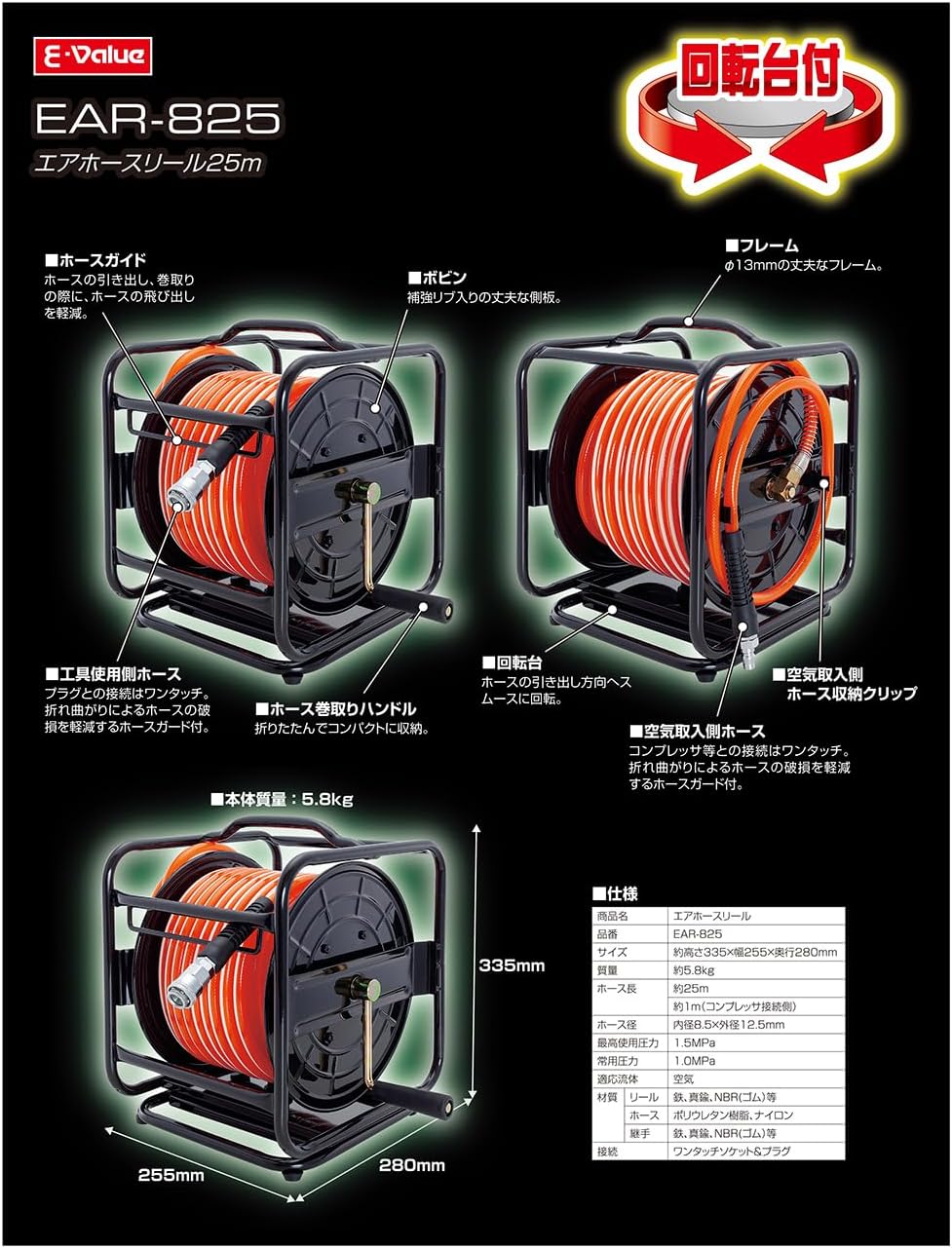 Air reel with swivel base of 8.5 mm thick hose with high flow rate. 8.5 mm [Use] Connects pipes with pneumatic tools and compressors and air sources, and retrieves storage of long compressed air hoses Features: Uses a 0.3 inch (8.5 mm) inner diameter hose that allows the tool to fully demonstrate its ability, reducing pressure loss that grows larger as the hose is extended, making it ideal for continuous work of rotary air tools and dusters. Excellent visibility at work sites, uses polyurethane hose with bright orange light and durable material. One-touch socket that is easy to put on and take off. Plug and hose guard to reduce hose damage caused by bending bends. A sturdy reel with a 0.5 inch (13 mm) diameter pipe and reinforced ribbed sideplate. It has a hose winding handle that can be folded and stored compactly. Includes a hose guide to reduce the j hose popping out when winding or drawing. The 86.6 ft (25 m) air hose can be easily stored and stored simply by the handle and is compact enough to store in a 13.8 inches (35 cm) square space. Lightweight and durable urethane resin hose.