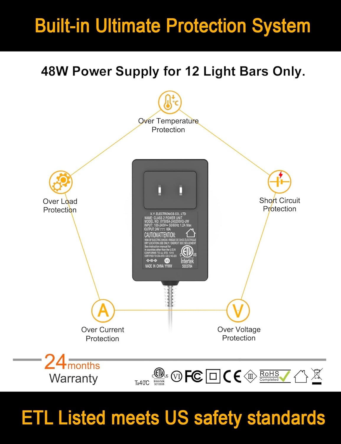 Included Components 1.2m / 4ft External Cable & Install Accessories, ETL Listed 48W Power Supply, Midway Input Jack / Splitter, Touch Dimmer, Under Counter Lights Built-in 18" Adjustable Cable