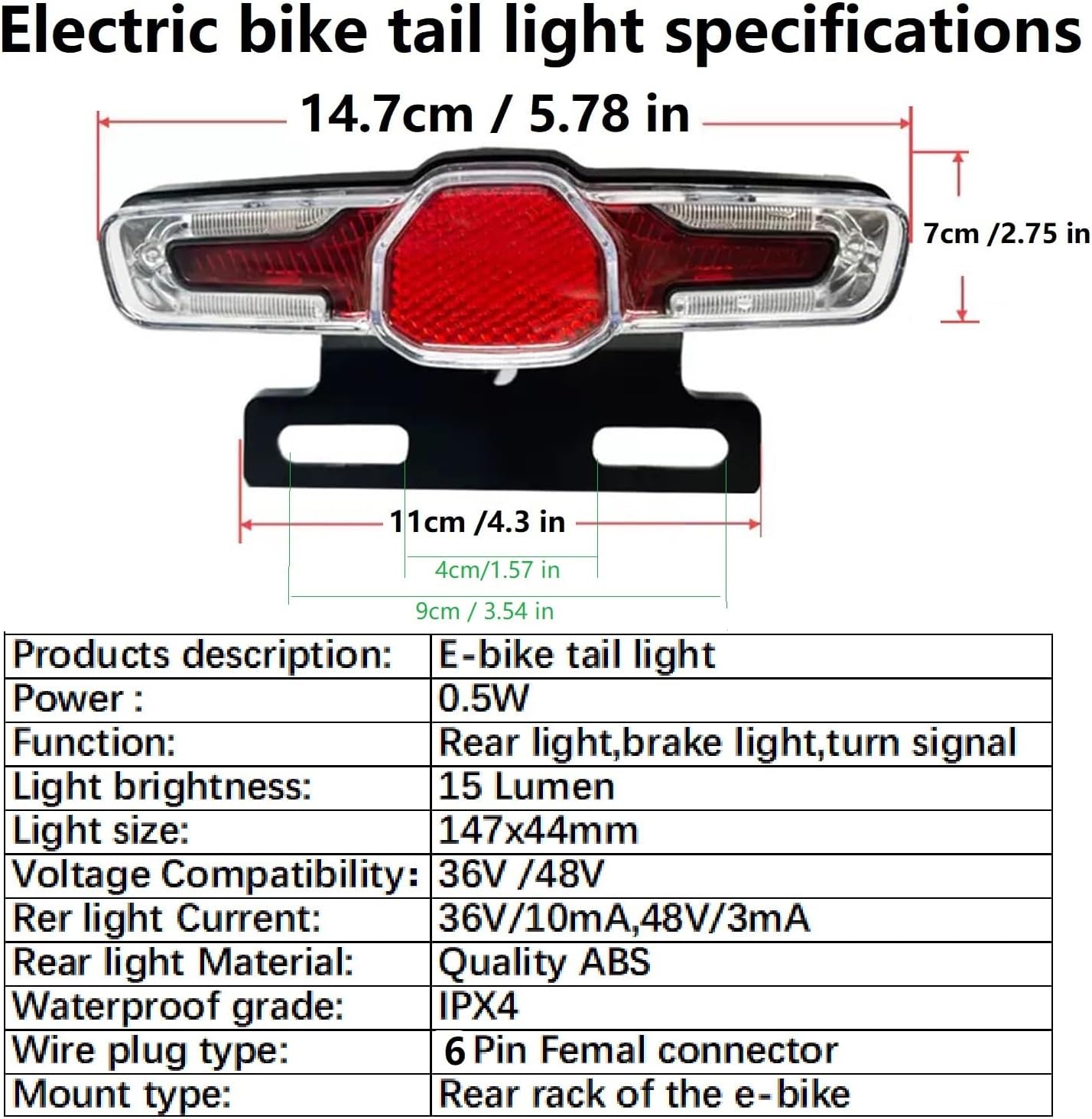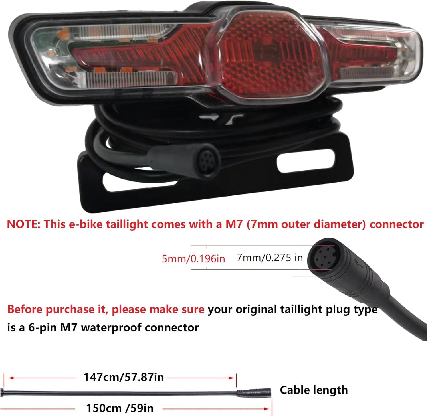 The e-bike taillight will ensure your safety when traveling at night. The taillight works with DC 36V-48V ebike controllers or batteries, featuring a M7 6-pin female connection system for reliable power delivery Package included: 1 PC LED Tail light Headlight specifications: Tail light suitable for e-bikes voltage: 36V-48V Mounting type: E-bike Rear rack mount / Seat mount Tail light material: Plastic Waterproof Rating: IPX4 (rain/splash resistant) Dimensions: 3.7x1.14x1.5IN Wire length: 59 IN Tail light plug type: 6-pin female waterproof connector Headlight weight: 74 Grams Package weight: 135 Grams Note Before purchase: This product is not suitable for bicycles. Please pay attention to the product specifications and wiring specifications before purchase to avoid losses due to improper use. Important Notice About the wire: Before purchase the bike light, please check the bike voltage and the connector type of your e-bike to make sure that it can match with this e-bike light. Due to the different wiring sequences of various bicycle lights, if the light fails to work properly after installation, please contact us immediately. We will provide assistance to ensure the correct installation and normal operation of the light.