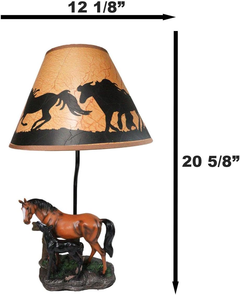 Description • This beautiful lamp comes with the shade as pictured. Made of polyresin, hand painted and polished, the quality finish is superb! Because all our products are individually hand painted work of art, the color tone may vary from the pictures. • The overall lamp measures about 19" tall. The shade 12" in diameter and 7.25" tall. • The body of the lamp measures 13.25" tall, 8.5" long and 5.5" deep. • Use only Type A light bulb (not included), Max 40 watt. Approx. 4 1/2 ft. UL Approved electric cord with on/off switch. Ebros Horse Mare & Foal By Ranch Fence Desktop Table Lamp With Shade Decor 19"H Video will open in a new window Using the mobile app? Copy this link into your browser:
