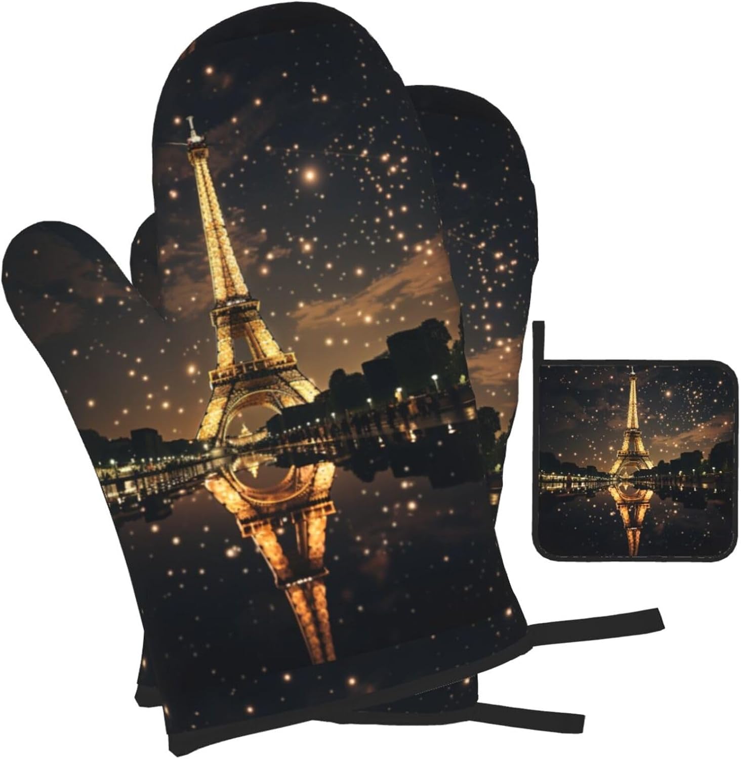 upgrade your kitchen safety with this Eiffel Tower print microwave gloves, oven mitts and pot holders sets. crafted from water repellency polyester and heat-resistant fabric, these kitchen baking three piece set offers reliable protection for hands while handling hot items. the double-layer waterproof design ensures easy cleaning after use. suitable for various cooking scenarios including microwave ovens, conventional ovens, stovetop cooking, and outdoor grilling. the side hanging rope allows convenient storage when not in use. the thick construction provides excellent heat insulation without compromising dexterity. this unisex kitchen essential combines functionality with practical design for everyday cooking needs. the heat-resistant gloves maintain comfort while offering superior protection against burns. an essential addition to any modern kitchen setup