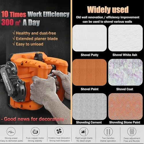 Are you looking to enhance your wall renovation projects with efficiency and precision? Discover the benefits of our Electric Wall Planer, designed to elevate your DIY experience. Say goodbye to the slow and imprecise methods of manual wall planing. This powerful tool not only increases your cutting efficiency by up to three times but also significantly reduces labor time by 70%. Achieve a professional-grade finish with minimal effort, allowing you to complete your renovation tasks faster and with less sweat. **Key Features:** - **High-Strength Alloy Steel Blade:** Equipped with multiple, durable blades that resist wear, this planer saves you valuable construction time. - **Robust ABS Shell:** Made with high-quality ABS plastic, our wall planer is designed for durability and a long lifespan, ensuring it withstands the rigors of your projects. - **Ergonomic Double Handle Design:** The comfortable two-handed operation makes it easier to maneuver, allowing for extended use without fatigue. - **Efficient Copper Wire Motor:** With a larger copper wire for improved heat dissipation and built-in overload protection, this motor ensures safe and reliable performance. - **No Blind Spots:** Our innovative side shaft shovel design eliminates left and right blind spots, providing thorough smoothing for every inch of your wall. **Specifications:** - Product Name: Electric Wall Planer - Material: ABS Shell / Alloy Steel - Power: 5800 W / 6800 W - Speed: 9000 RPM - Net Weight: 4.55 kg - Dimensions: 265 x 220 x 170 mm (10.43 x 8.66 x 6.69 in) - Depth: 4 mm - Width: 125 mm - Cable Length: 3.3 m - Applications: Ideal for old wall renovations, wall smoothing, and concrete polishing. **Package Includes:** - 1 Electric Wall Planer **User Precautions:** For safety, handle the tool with care, keep it out of children's reach, and use it in well-ventilated areas. Ensure vents remain unobstructed and unplug when not in use. Please note that slight color variations may occur due to li...