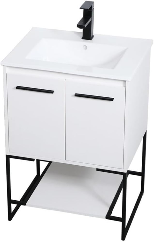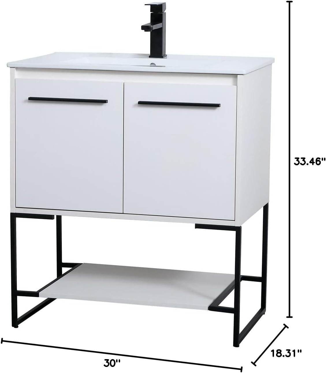 Live in modern comfort with this 30" white finish vanity. Dressed in a concrete gray and sleek black metal hardware, its contemporary style will have your bathroom or powder room elevated in industrial sophistication. The open shelf at the base and two doors reveal ample storage space for your bathroom essentials and miscellany. Clean lines create its own visual interest, adding trendy looks to your already chic room.Features:- Finish: White- Material: MDF, Porcelain, and Metal- Hardware Finish: Black- Hardware Material: Steel- Shape: Rectangle- Wood Type: MDF- Vanity Base Finish: White- Vanity Base Material: MDF- Vanity Countertop Finish: White- Vanity Countertop Material: Porcelain- Vanity Countertop Edge Style: Flat- Vanity Sink Material: Porcelain- Free-standing vanity with integrated sink- Faucet Type: Single (Not Included)- Number of Faucets: 1- Shelf Material: MDF- Number of Cabinets: 1- Leg Design: Bracket- Room of Use: Bathroom- Safety Stop: Yes- Integrated undermount porcelain sink- Convenient bottom shelf- Convenient access for plumbing installation with cut out back panel- Some minor assembly required- TSCA VI Certification- Drain assembly not includedSpecifications:- Product Dimensions: 33.46" H x 30" W x 18.31" D- Product Weight: 73 lbs- Shelf Dimensions: 3.94" H x 21.85" W x 17.83" D- Shelf Dimensions: 0.59" Thick- Product Dimensions: (Cabinet) 17.52" H x 28.27" W x 16.85" D- Product Dimensions: (Door Thickness) 0.59"- Leg Dimensions: 14.57" H x 29.37" W x 17.83" D- Top Dimensions: 0.79" H x 30" W x 18.31" D- Product Weight: (Countertop) 33 lbs- Product Dimensions: (Sink) 7" H x 18.11" W x 10.34" D- Product Dimensions: (Sink Drain Hole) 1.75"- Product Dimensions: (Vanity Faucet Hole) 1.38"- Product Dimensions: (Vanity Faucet Hole Distance from Countertop Top Edge) 2.17"- Product Dimensions: (Vanity Faucet Hole Distance from Countertop Side Edge) 15"- Product Dimensions: (Sink Drain from Countertop Side Edge) 15"- Number of Doors: 2- Number of Shelves: 1- Warranty: 1 Year