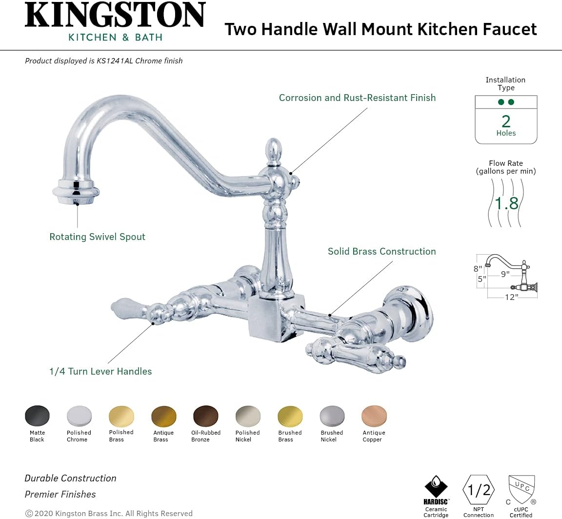 Two handle wall mount, 2 hole application, 8 inch centerset, fabricated from solid brass material for durability and reliability, premium color finish resists tarnishing and corrosion, 360 degree turn swivel spout, 1/4 turn on/off water control mechanism, 1/2 inch IPS inlets, ceramic Disc valve, 2.2 GPM (8.3 LPM) max at 60 PSI, integrated removable aerator, 8-1/2 inch spout reach from Faucet body, 8-1/8 inch overall height, ten year limited warranty to the original consumer to be free from defects in material and finish.
