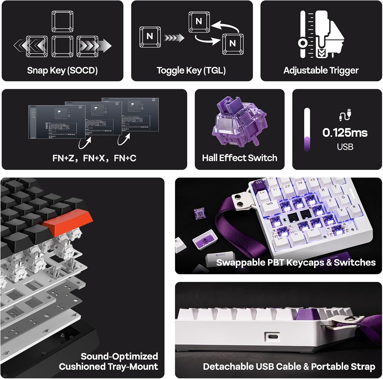 | BuiltIn Media | A USB A-to-C Cable and a multilingual manual, An HE30 Hall Effect Gaming Keyboard, Some Extra Switches, Tools for wrist strap and a 2-in-1 keycap-and-switch puller |