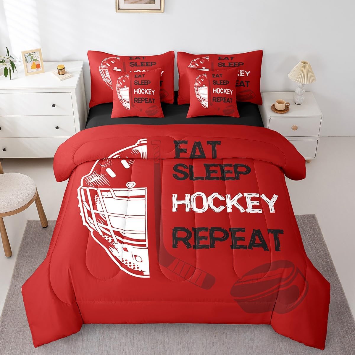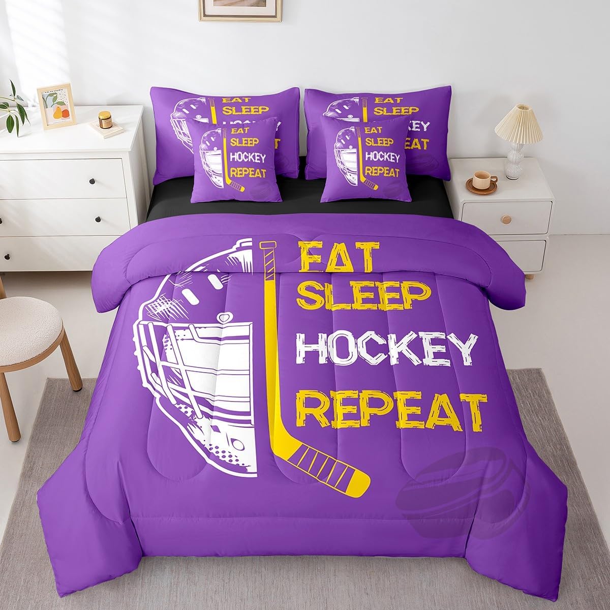 • Boys 7pcs Bedding:The bed sets feature bold, eye-catching graphics of hockey equipment and the iconic phrase 'Eat Sleep Hockey Repeat'. Suitable for hockey enthusiasts of all ages, this set will transform your bedroom into a hockey-themed sanctuary.