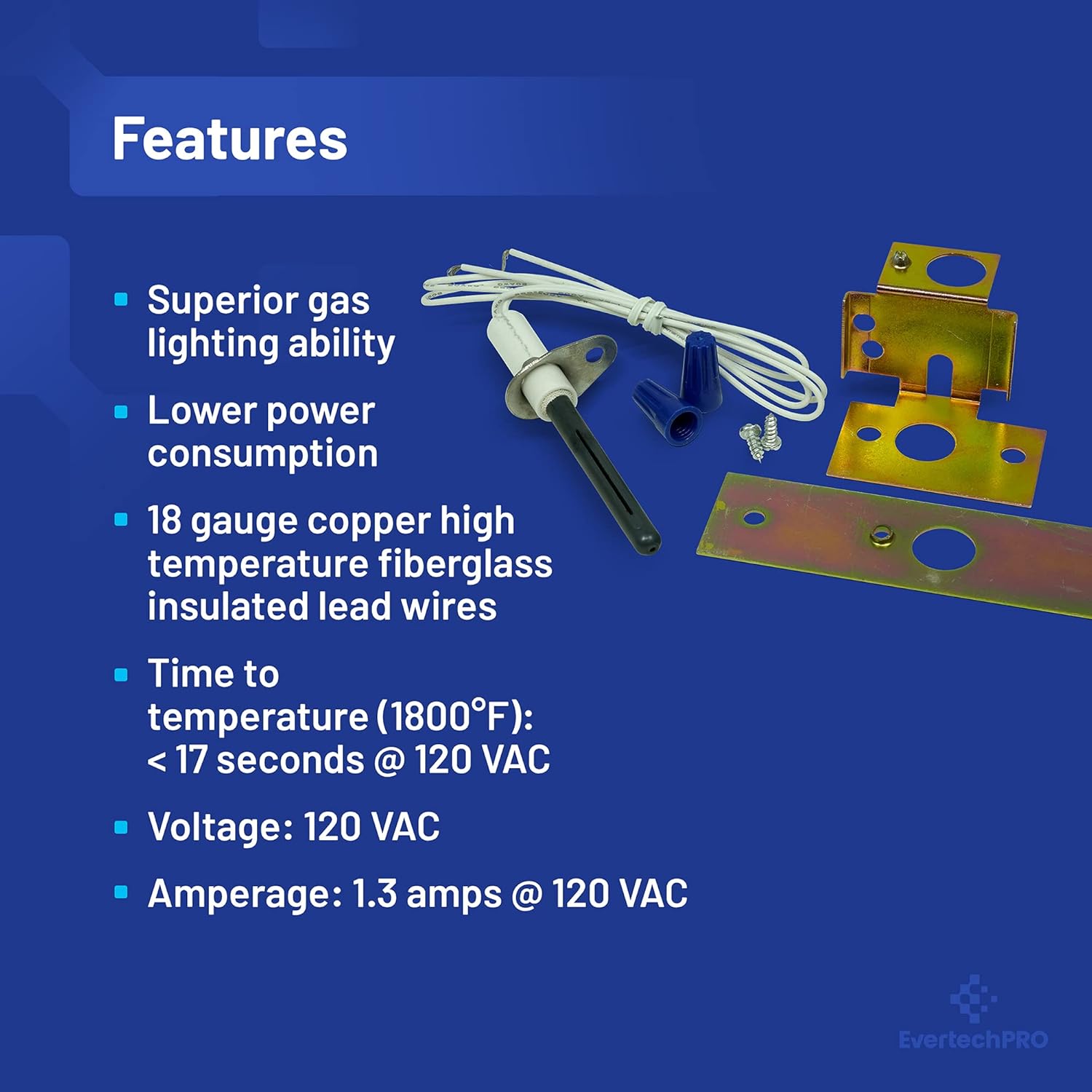 EvertechPRO HVAC Replacement Universal Round Silicon Nitride Igniter Kit Part Number SSN2000 replaces 025-27766-000 025-27774-000 025-29043-000 025-29050-000 025-32625-000 025-32626-000 025-33241-000 1009604 10399 10401009 1096048 1148245 120-07549 1380654 1380672 1380680 1474-051 14740511 14740512 1474-052 20015201 201D 201N 201W 20834 21D64-2 271W 340039P01 373-05342-700 38322B001 473-12509-001 511-330-139 511-330-190 511-330-193 62821-001 62821-002 67930 67931 67932 75-92-104 75-92-105 767A-301 767A-303 767A-306 767A-310 767A-311 767A-350 767A-353 767A-354 767A-357 767A-361 767A-364 767A-365 767A-366 9050 9302-094 94851 B138196P01 B144676P01 B144676P02 B340039P01 C238 C242 F767-A357 F767-A361 F767-A365 F767-A366 HSIURK120V IGN21 IGN23 IGN26 IGN30 LH33ZS001A LH33ZS002 P694-700-4-1This is not a Universal OEM product. Fits Universal HVAC. Use of the Manufacturers trade names and logos are the registered trademarks of their respective owners. Any use of the Manufacturers brand name, part numbers or model designation for this product is made solely for purposes of demonstrating and for identification compatibility and are displayed for descriptive purposes only. Use of them does not associated with, imply any affiliation or endorsement by any manufacturer.