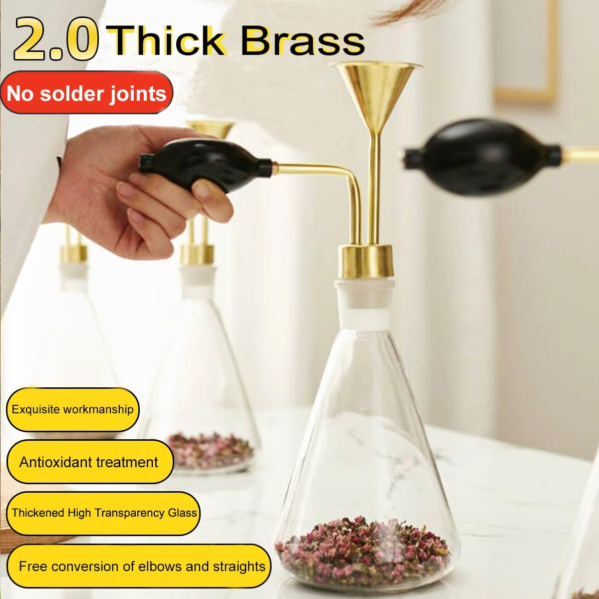 Material: 2. 00mm thick brass and High-permeability glass material Shape:Rectangular Shape Size:350*130mm/13.78''X5.12'' Printing: Without printing Package: 1pcs/bag More:These Erlenmeyer flask have wide range of use;they are suitable for perfume paper display and smelling etc. 1.Can be used in perfume counters, perfume rooms,etc. 2.It is convenient for perfumers to smell the fragrance of perfume. 3.It can be better decorated and displayed,if you want to add logo,it can print corporate LOGO,various patterns,publicity slogans,etc.,which can improve corporate reputation and promote corporate brand 4.It is fast to attract more consumers,and obtain more revenue for the company. NOTE: The conical beaker has an attached air bladder that can be pressed to smell the perfume/oil/wine inside the bottle. The MOQ of custom logo is 50pcs.We support custom logo, please feel free to contact us Our goods are composed of brass + borosilicate glass are handmade - brass part of the hand-beaten production of borosilicate glass artificially blown and become, may not be very perfect, very mindful of those who are careful to buy. Brass part of the later use may appear oxidation, this is normal, not a quality problem. If you receive the goods are damaged, please put together with the face sheet and take a picture within 24 hours to contact us for you to solve the problem. Thank you for your understanding and support!