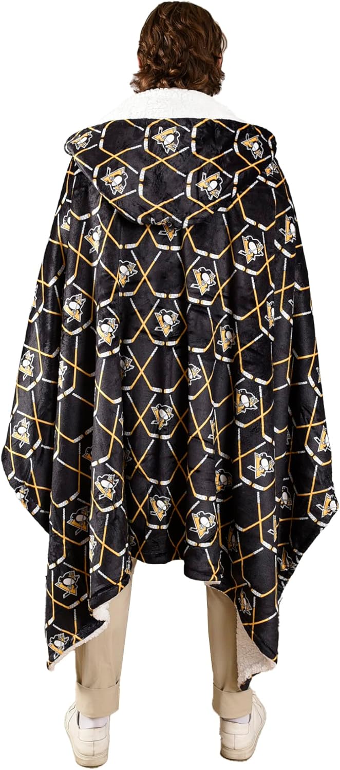 Cheer on your favorite hockey team and experience everyday comfort when you wrap yourself in this extremely plush sherpa NHL hooded blanket. Perfect for all-seasons when you want to lounge, relax and watch the hockey game. Featuring a cozy sherpa lined hood and two corner hand pockets, this throw is great for both indoor and outdoor use – especially on a summer night by the fire to keep your hands, head and ears warm!
