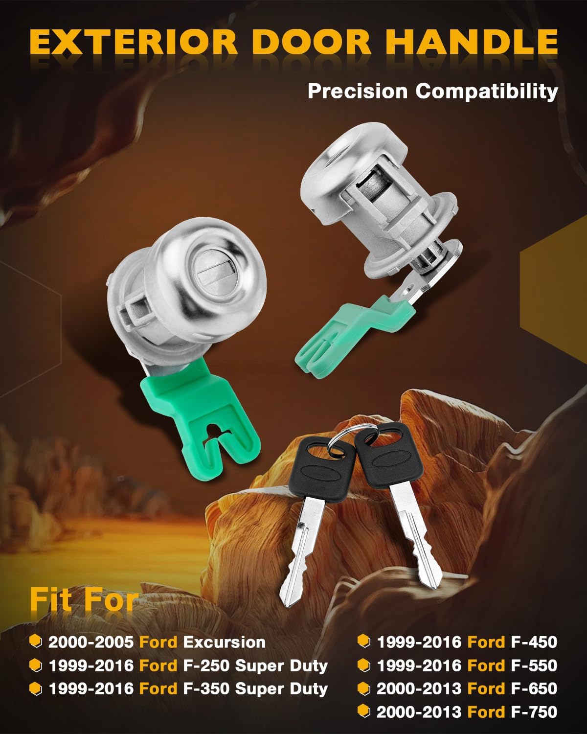 Packing List:1x Front Left Driver Side Exterior Door Handle, with Key Hole1x Front Right Passenger Side Exterior Door Handle, with Key Hole2x Door Lock Cylinders2x KeysCondition: NewCompatible with:2000-2005 Ford Excursion1999-2016 Ford F-250 Super Duty Truck1999-2016 Ford F-350 Super Duty Truck1999-2016 Ford F-450 Truck1999-2016 Ford F-550 Truck2000-2015 Ford F-650 Truck2000-2013 Ford F-750 TruckPrecise Fit Part Numbers:7C3Z2522405AA, FO1310123, 79306,7C3Z2522404AA, FO1311123, 79307, 7C3Z2522404-AA-MTL, 7C3Z2552404CA, F81Z2522404-BAB, F81Z2522404BAC, FO-3523A-FR, 4C3z2522404aa,703362, 597638, 7C3Z1521990ABroken door handle? Can't get in your car? Are you searching for the highest quality, best replacement value door handle? We deserve it. Our Door Handle kit, to replace your old or broken part, will meet or exceed OEM standards.