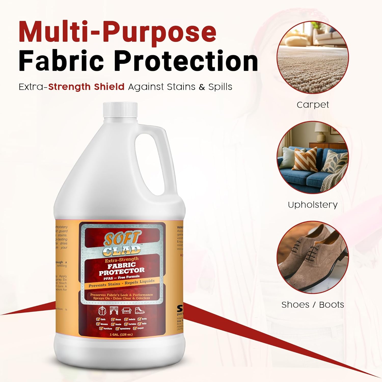 SoftClad is a PFAS free, water based, fabric protector. It will help protect furniture, shoes, carpet, upholstery, suede, leather and more from stains. This one gallon bottle is available to refill our 32oz trigger sprayer.