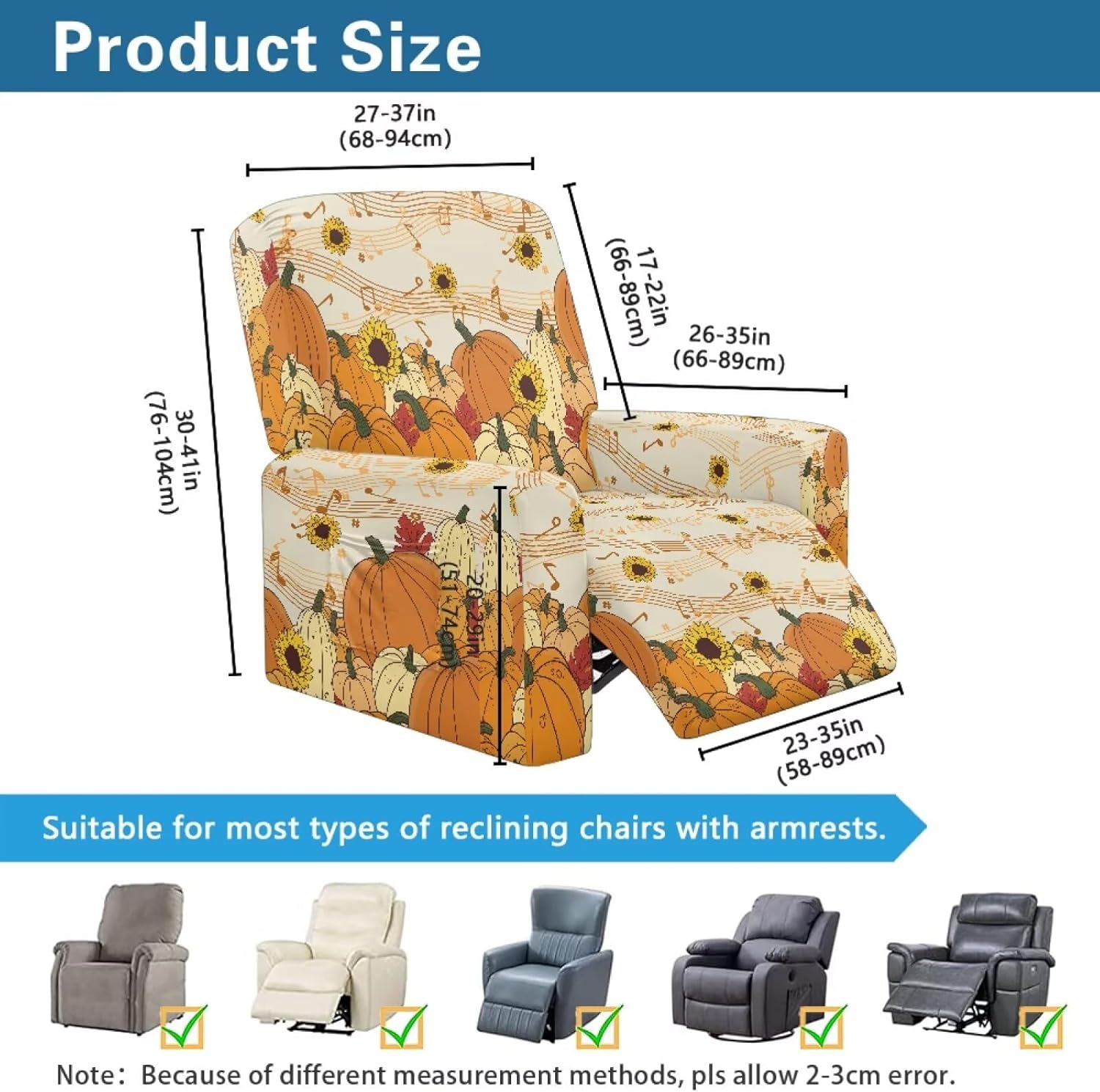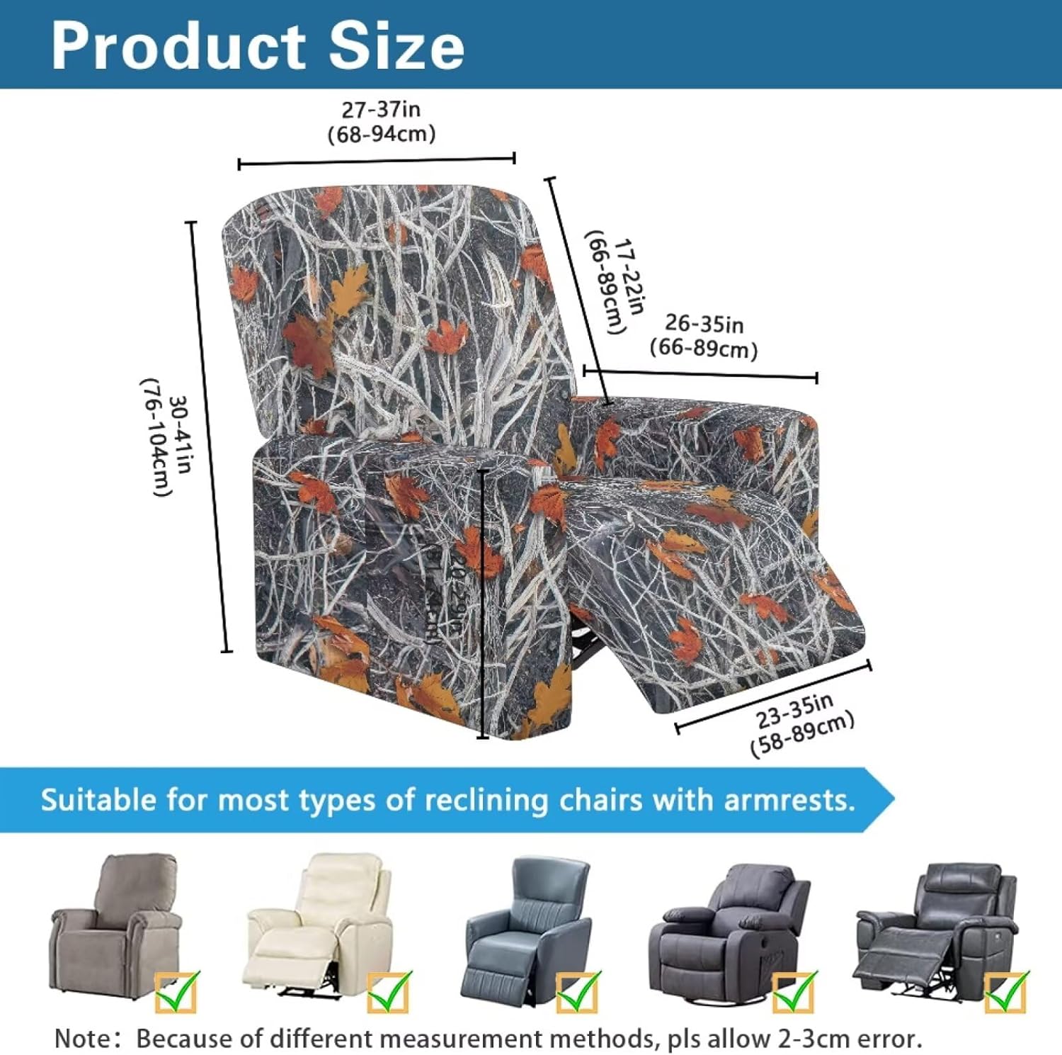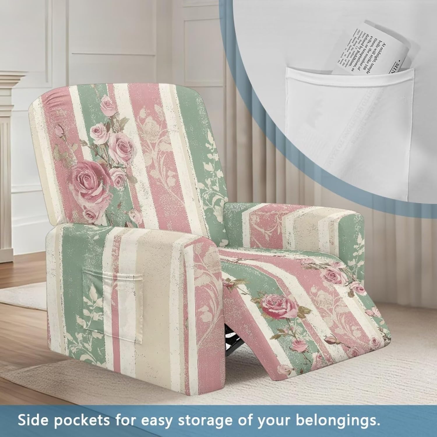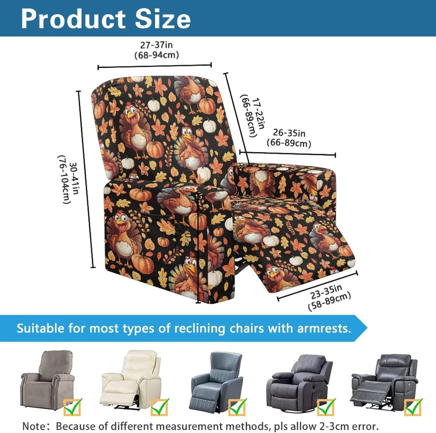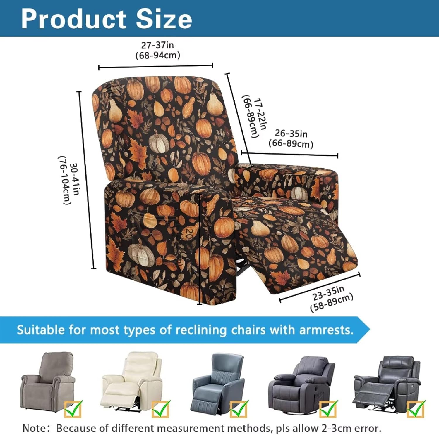 Package included:1x YECARYPOD Recliner Slipcover Recliner Chair Cover with Side Pocket Product: -Material:Stretch Polyester & Spandex,soft,breathable and machine washable -Vivid Stylish Color and Print Design,halloween,fall,thanksgiving,christmas,boho,tribal aztec,American flag,leoparad print,dog paw,sunflower,butterfly,etc -Easy to install & Care -Elastic Band and Loops Warm Tips: -Due to manual measurement, there may be 1-2cm deviation exist. -Actual color may be slight difference between the monitor display picture because of the light brightness. -If you have any questions, please feel free to contact us. We will reply you within 24 hours.