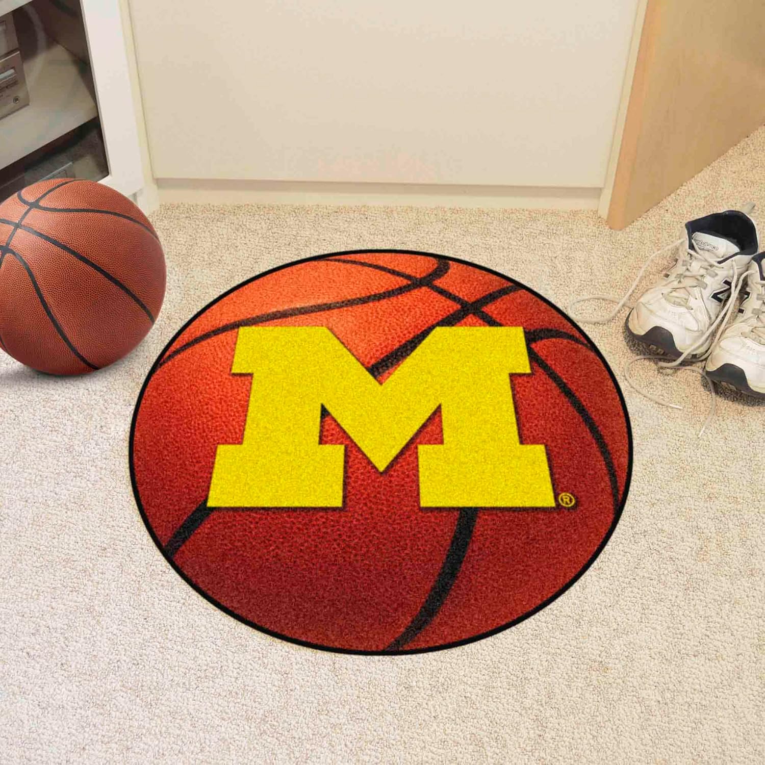 FANMATS 3404 Michigan Wolverines Basketball Shaped Rug - 27in. Diameter, Basketball Design, Sports Fan Accent Rug