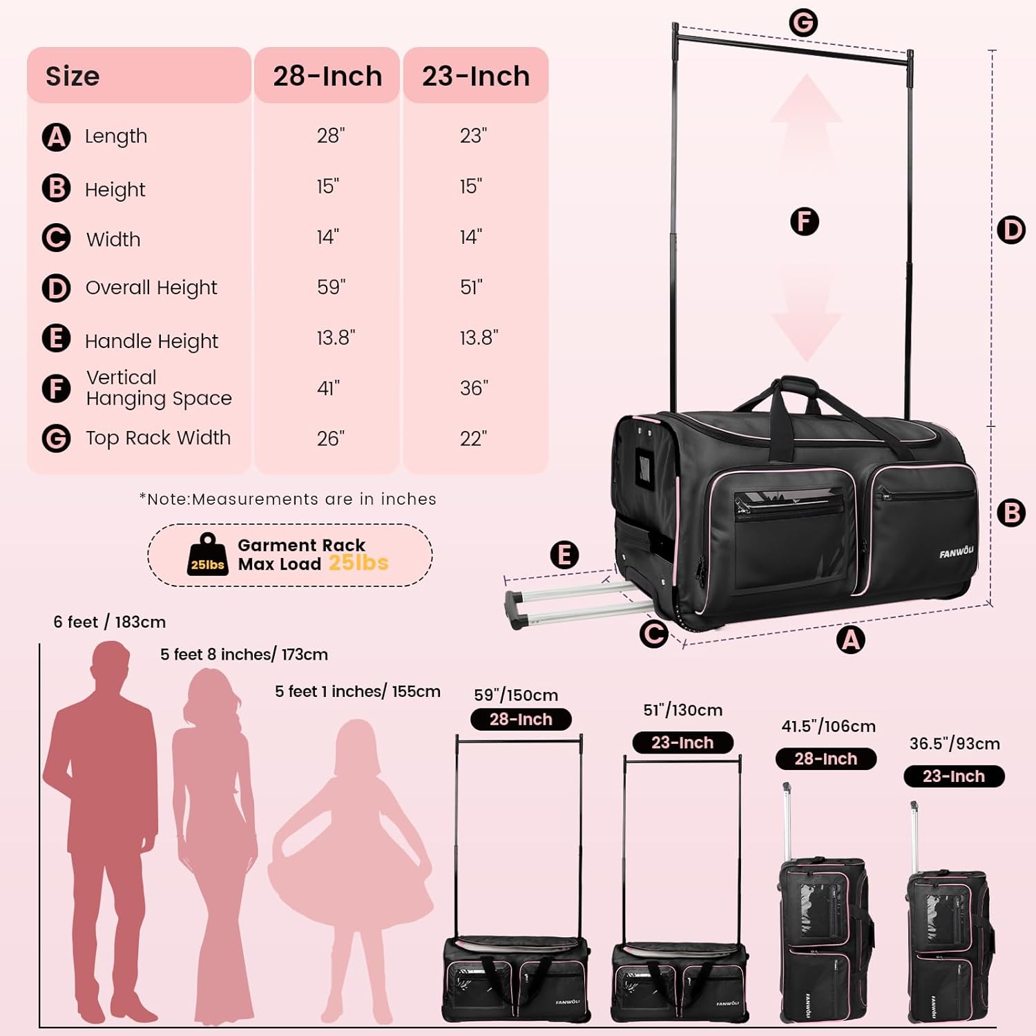 Effortlessly transport all your dance essentials with this professional dancer's favorite rolling garment bag. Featuring a durable ALUMINUM ALLOY HANDLE and SILENT WHEELS, it simplifies performance travel. With a spacious design including 10 MULTIFUNCTIONAL POCKETS and a lightweight 23" duffle bag, you can pack up to 10 costumes and more without worrying about overweight charges. Stay prepared and focused on your dreams with this versatile dance bag that doubles as a portable wardrobe for various professionals. Built to last with an enhanced anti-tipping design and a stable DUAL SUPPORT SYSTEM, this bag is crafted from water-resistant 300D OXFORD CLOTH COMPOSITE PVC for durability and shape retention, making it the perfect companion for all your competitions and awards.