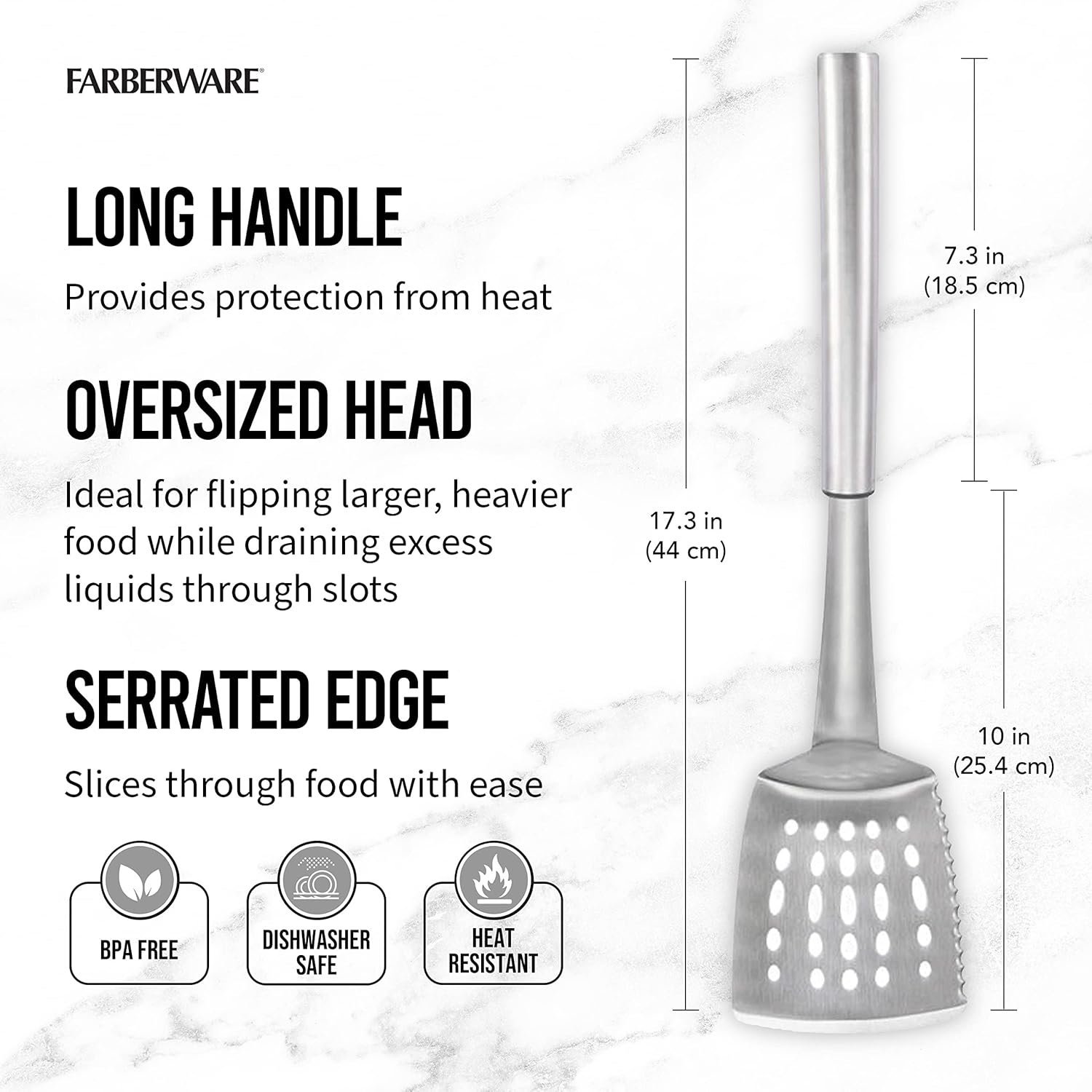 This Farberware BBQ 3-Piece Stainless Steel Tool Set includes all the essentials tools you need to flip, turn, baste, and transport foods on the grill. The turner features an oversized head to take on even larger slices of meat, a serrated edge for easy cutting on the fly, and slots that help drain away excess liquids. The large silicone bristles on the basting brush glide smoothly over food for optimal results, and the head is heat resistant to 500°F/260°C and safe for use on all cookware, including nonstick. The tongs are designed with stainless steel teeth to firmly grip food and prevent dropping, plus an easy-lock mechanism that allows for convenient storage. Each tool has a long stainless steel handle to keep hands away from the heat. 3-piece set includes Slotted turner, basting brush, and tongs. Dishwasher safe. .