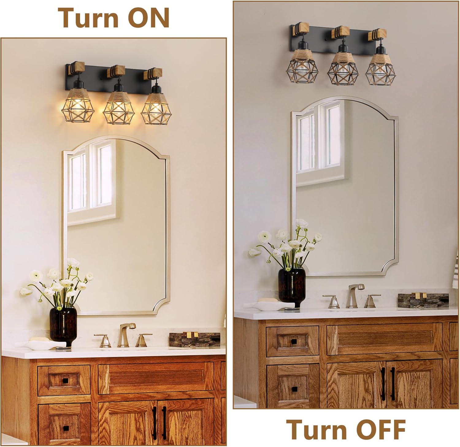 | Other Special Features of the Product | 3* 60W E26 Base Bulbs(BULBS NOT INCLUDED), Boho Bathroom Vanity Light, Combine Metal and Wood and Wicker, Diamond Metal and Wicker Shade, Farmhouse Bathroom Vanity Light Fixture |