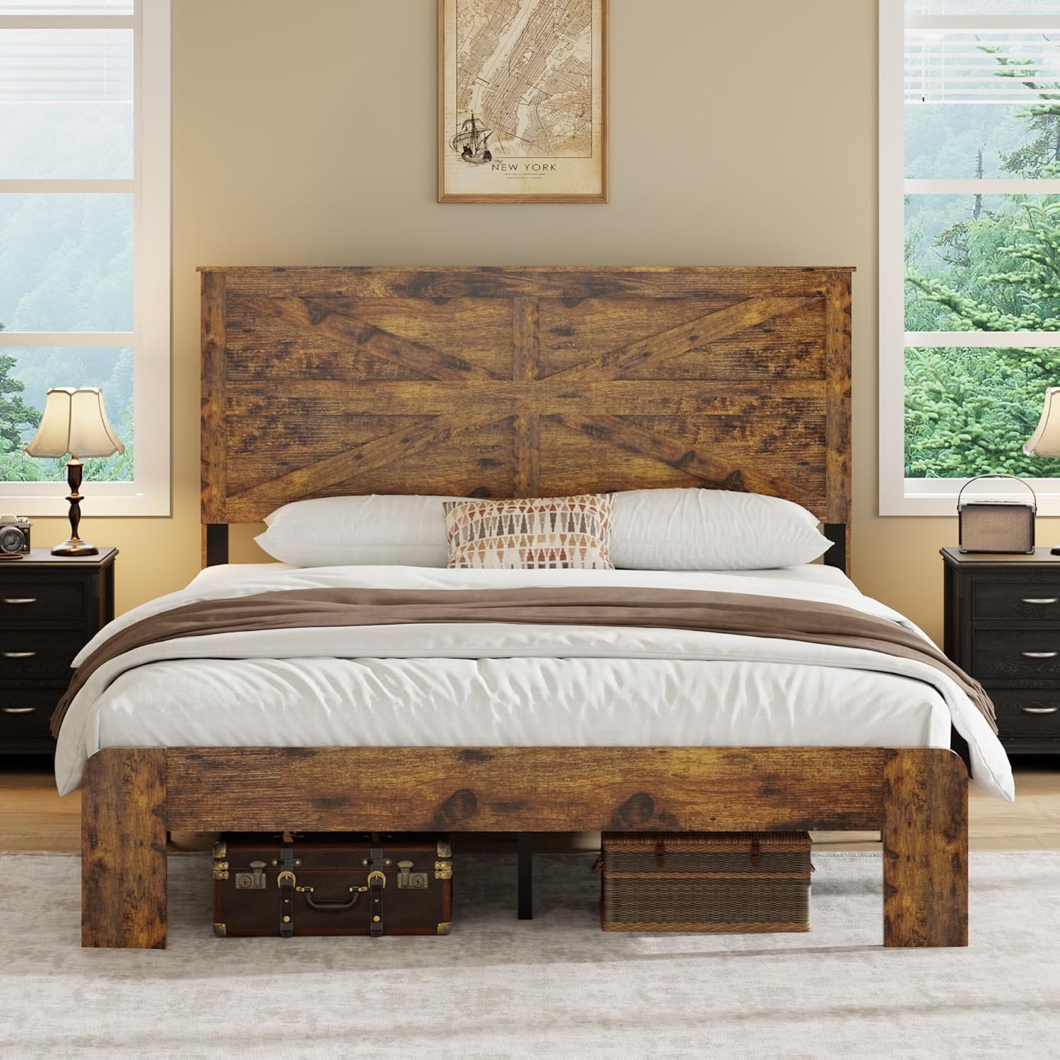 • Farmhouse King Size Platform Bed Frame: Elevate your bedroom with our exquisite king size wooden bed frame, featuring a simple classic farmhouse headboard and footboard design. Accented with sleek black metal hardware, it adds texture and clean lines to your space, seamlessly blending modern and rustic charm.