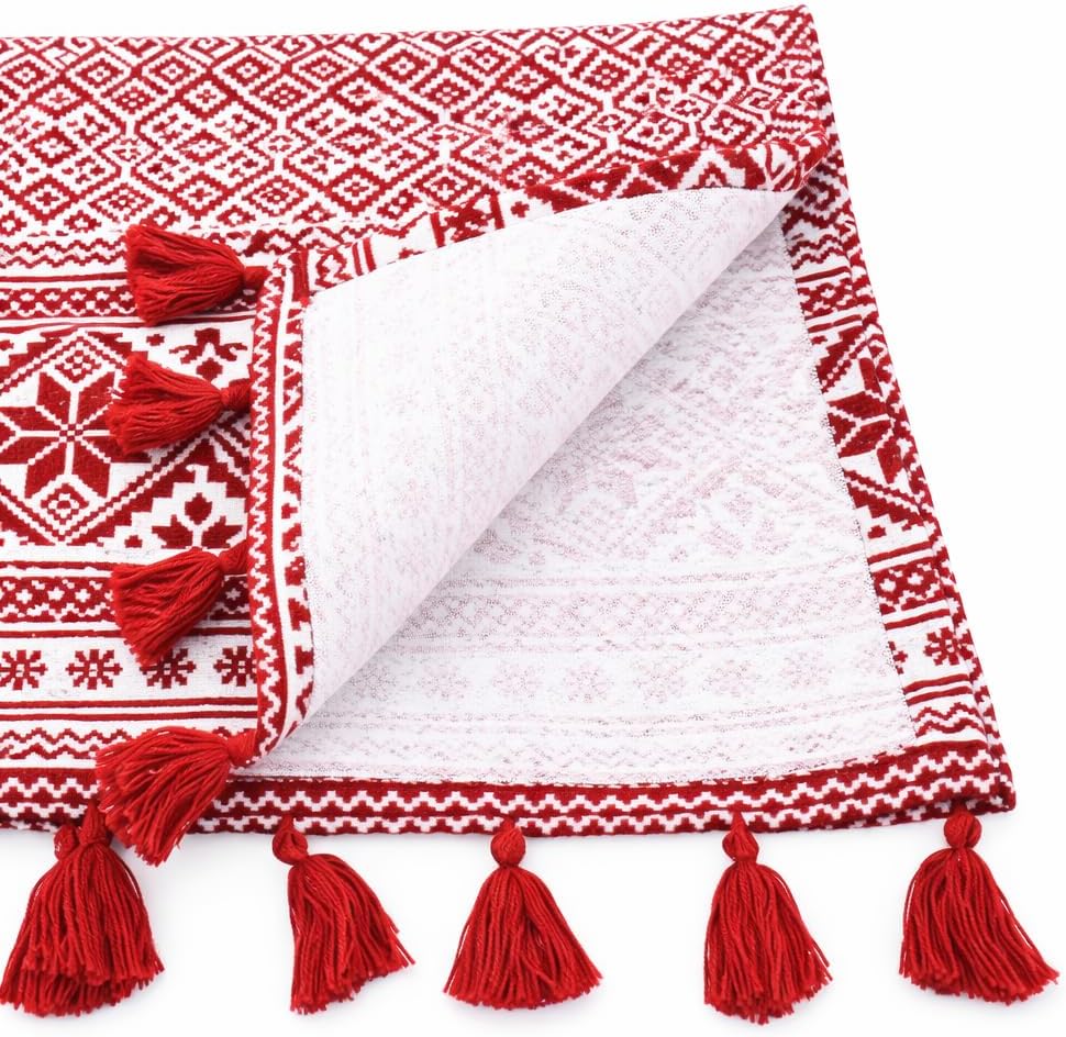 Nordic Christmas Pattern Tassel Cotton Table Runner:Featuring red on pure cotton, the traditional holiday colors and tasseled edges give this cotton table runner an updated look on a traditional style, make your holiday celebrations special with this lovely runner. This festive table runner is a perfect choice for tasteful kitchen linens for your holiday use indoor and outdoor decoration. We craft our woven table runner from superior quality with 100% cotton construction, it can easily stand up to the demands of mealtime. Durable, comfortable and easy to clean. The red table runner charms at elaborate holiday feasts and casual winter get-togethers. PRODUCT DETAILS :Dimensions: 16 x 72 inchesMaterial: cotton Care Instructions: cold machine wash, gentle cycle; no bleach, tumble dry low, Medium IronOur Philosophy:At Fennco Styles you can shop a carefully selected range of home, lifestyle and gift products. We believe our homes should be reflections of the journeys we take. Our personal spaces deserve designs with a soul, a story, and a purpose. Our lifestyle brand offers inspired living through high-quality products, exclusive designs, and timeless style. We aim to source ethically, looking for products that are made from sustainable materials and designed to last and seeking out Makers that are conscious of their impact on the environment.Click Add To Cart to order your White sheer tablecloth and curate a contemporary and personalized aesthetic in your home, today!