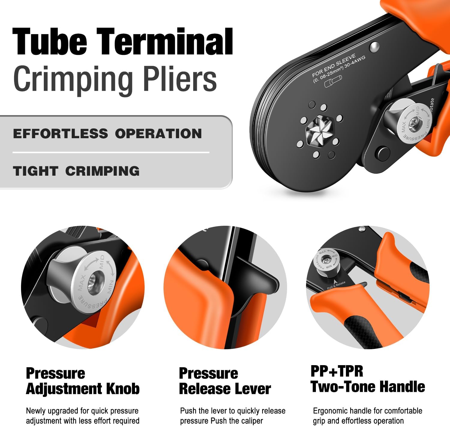 This professional-grade crimping tool kit comes with a versatile SJC8 25-6 crimping plier and 1000 tube-type terminals, perfect for electrical work. The plier handles wires from 0.08-25mm² (30-4 AWG) and features an ergonomic PP+TPR two-tone handle design for comfortable extended use. At 8.03 inches long, this tool offers precise control and effortless operation through its pressure adjustment knob and quick-release lever system. The included terminal assortment comes organized in a convenient case measuring 8.1 x 4.09 inches, containing various colored terminals for different applications. The self-adjusting mechanism ensures consistent crimping results every time, while the durable construction promises reliable performance for both professional electricians and DIY enthusiasts. The tool's compact size and comprehensive terminal set make it an excellent choice for automotive, industrial, or home wiring projects.