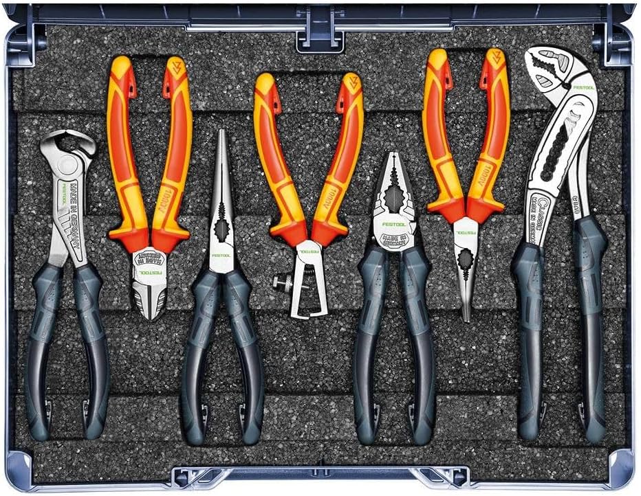 El set de alicates para todas las necesidades. Ventajas y beneficios Edición limitada: disponible solo por poco tiempo Set completo: alicates para bombas de agua, alicates universales, alicates de corte lateral (con aislamiento VDE), alicates de punta recta, alicates de punta curva (con aislamiento VDE), alicates pelacables (con aislamiento VDE), tenazas Alta calidad: siete alicates "Made in Germany". Robusto y de larga vida útil: para trabajos exigentes de sujeción, agarre, doblado y corte Manejo cómodo: Agarre cómodo y sujeción fuerte gracias a las fundas de varios componentes Siempre a mano: todos los alicates se guardan de forma ordenada y segura en un accesorio para herramienta especial en el Systainer³ azul Compatible: Los alicates Systainer se adaptan a todo el sistema Systainer³ de Festool: fáciles de acoplar y transportar Aplicaciones principales Equipado de forma flexible para diversos trabajos de sujeción, agarre, plegado y corte en materiales planos y redondos Para pelar conductores simples, multifilares y de hilos finos con aislamiento estándar Dotación de suministro accesorio para herramienta EPP, alicates para bombas de agua: para trabajar con tubos, tornillos y manguitos; con soporte de clavo y soporte de alambre; mordazas de agarre de doble dentado, alicates combinados: para trabajos de sujeción, agarre, doblado y corte; zonas de agarre para material plano y redondo; para cortar alambres duros (Ø 2.2 mm) y blandos (Ø 5.2 mm); con soporte de clavo y soporte de alambre y llave poligonal integrada, cortadores laterales: con aislamiento VDE; para cortar alambres duros (Ø 2 mm) y blandos (diameter 6 mm); mangos con cubiertas de seguridad de varios componentes según DIN EN/IEC 60900, alicates de punta recta: para trabajos de sujeción, agarre, doblado y corte; para cortar alambres duros (diameter 2.2 mm) y blandos (diameter diameter 3.9 diameter diameter mm); con mordazas largas y planas y redondas; superficies de agarre dentadas; llave poligonal integrada (18 mm), alicates de punta curva: con aislamiento VDE; para trabajos de sujeción, agarre, doblado y corte; para cortar alambres semiduros Ø 1, 6 mm) y blandos (diameter 2.5 mm); con mordazas planas y redondas largas, en ángulo de 45°; superficies de agarre dentadas; llave poligonal integrada (15 mm); mangos con cubiertas de seguridad de varios componentes según DIN EN/IEC 609. 000, alic. ates pelacables: con aislamiento VDE; para pelar conductores simples, multifilares y de hilos finos con aislamiento estándar; con borde de corte en forma de V para alambres e hilos hasta un máximo de Ø 5 mm o 10 mm²; corte transversal del conductor; con tornillo de a. juste para un fácil ajuste al diámetro de alambre o hilo deseado; con resorte de apertura; mangos con cubiertas de seguridad de varios componentes según DIN EN/IEC 60900, tenazas: para agarrar y extraer tornillos, clavos, fijaciones, así como para cortar varas y alambres metmetmetmetálicos, Systainer SYS3 M 112 azul, en caja de cartón Garantía all-inclusive