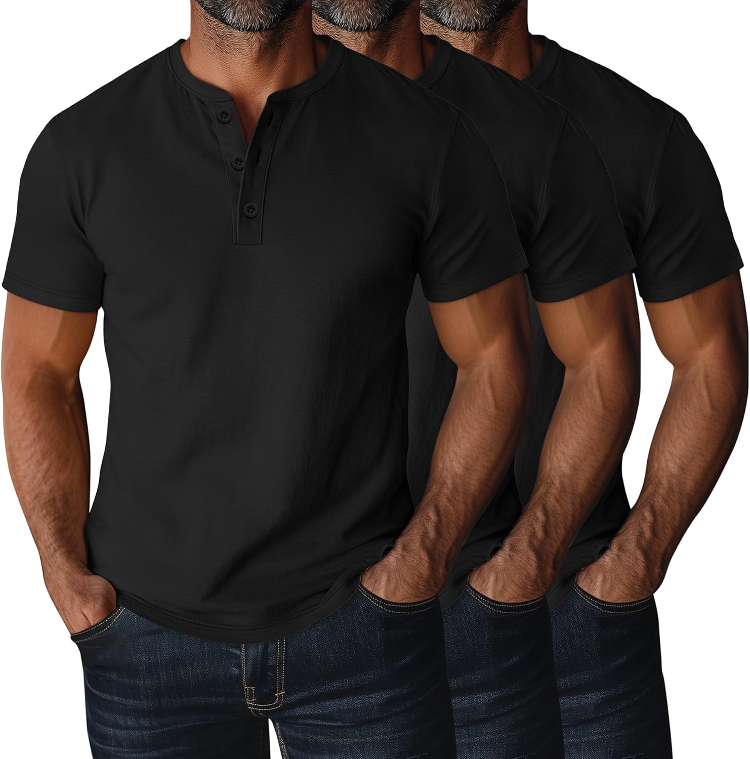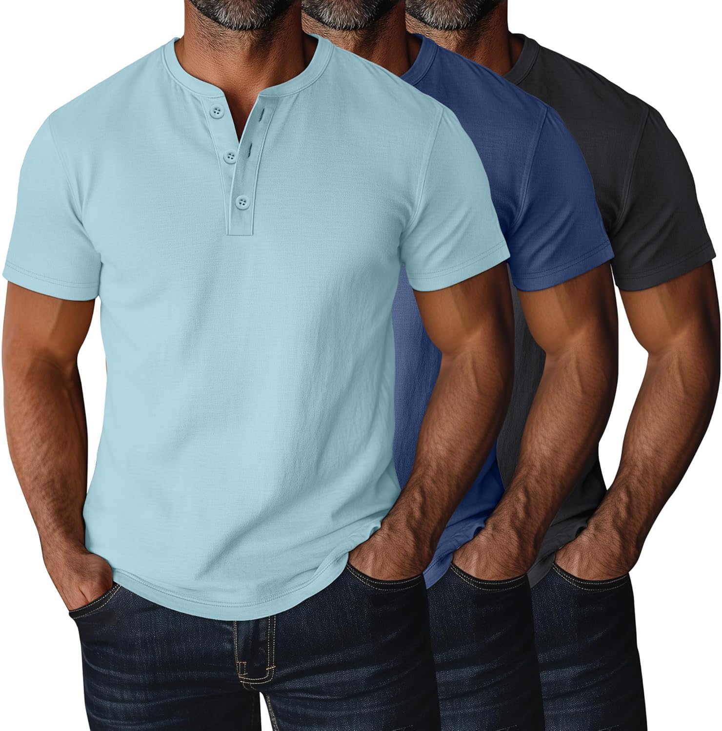 Features: You will get 3 pack men's henley tops in different solid colors. Ideal for you to wear in spring, summer, fall, or wear them as a base layer with a jacket, coat or cardigan in winter. Our men's plus size henley T shirts are easy to maintain as they can be hand washed in cold water or machine wash on gentle cycle. Remember to wash separately and avoid bleach to retain the shape and color of the shirt. Specifications: Material: 60% polyester, 35% cotton, 5% spandex Package includes: 3 x Men's plus size henley T shirts Notes: Manual measurement, please allow slight errors on size. The color may exist a slight difference due to different screen displays
